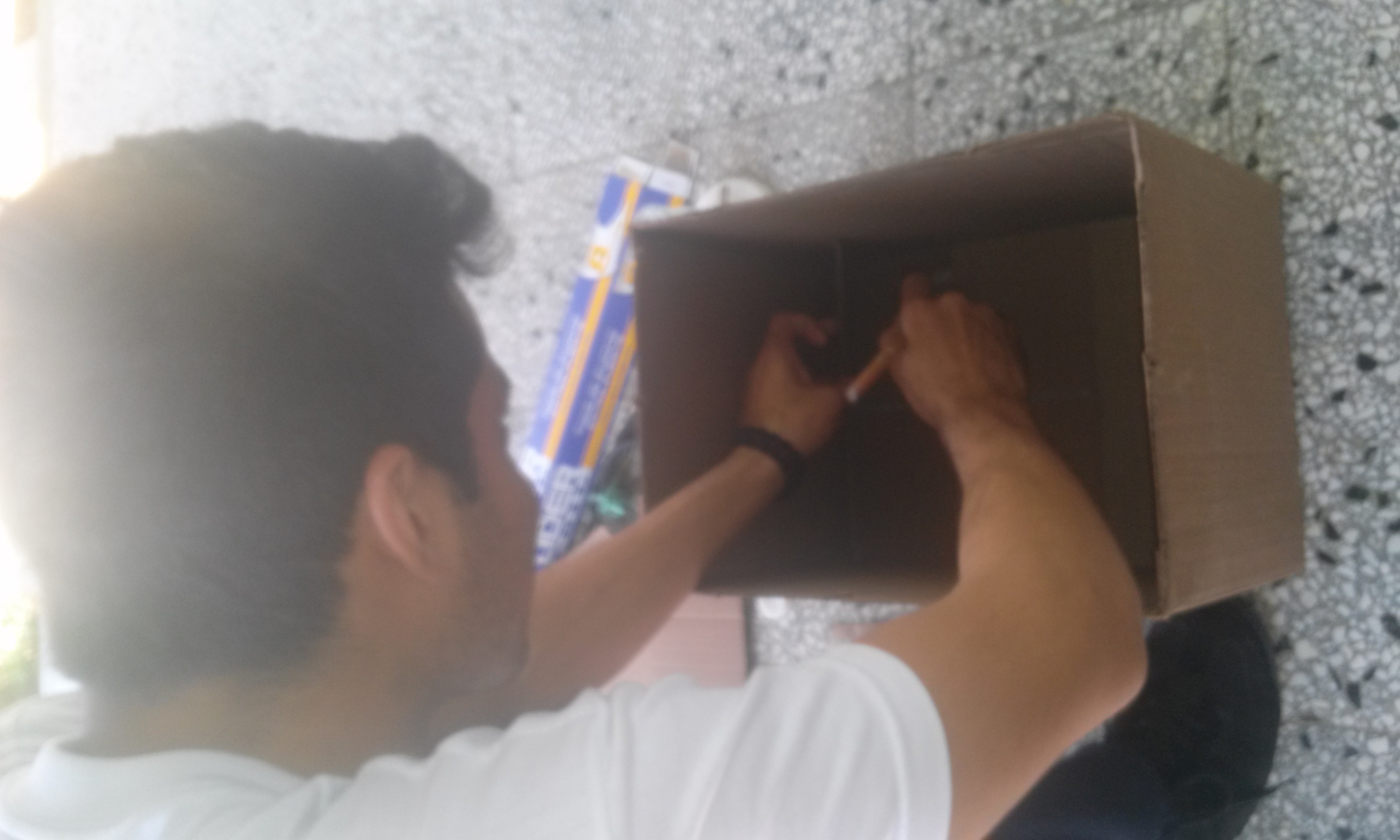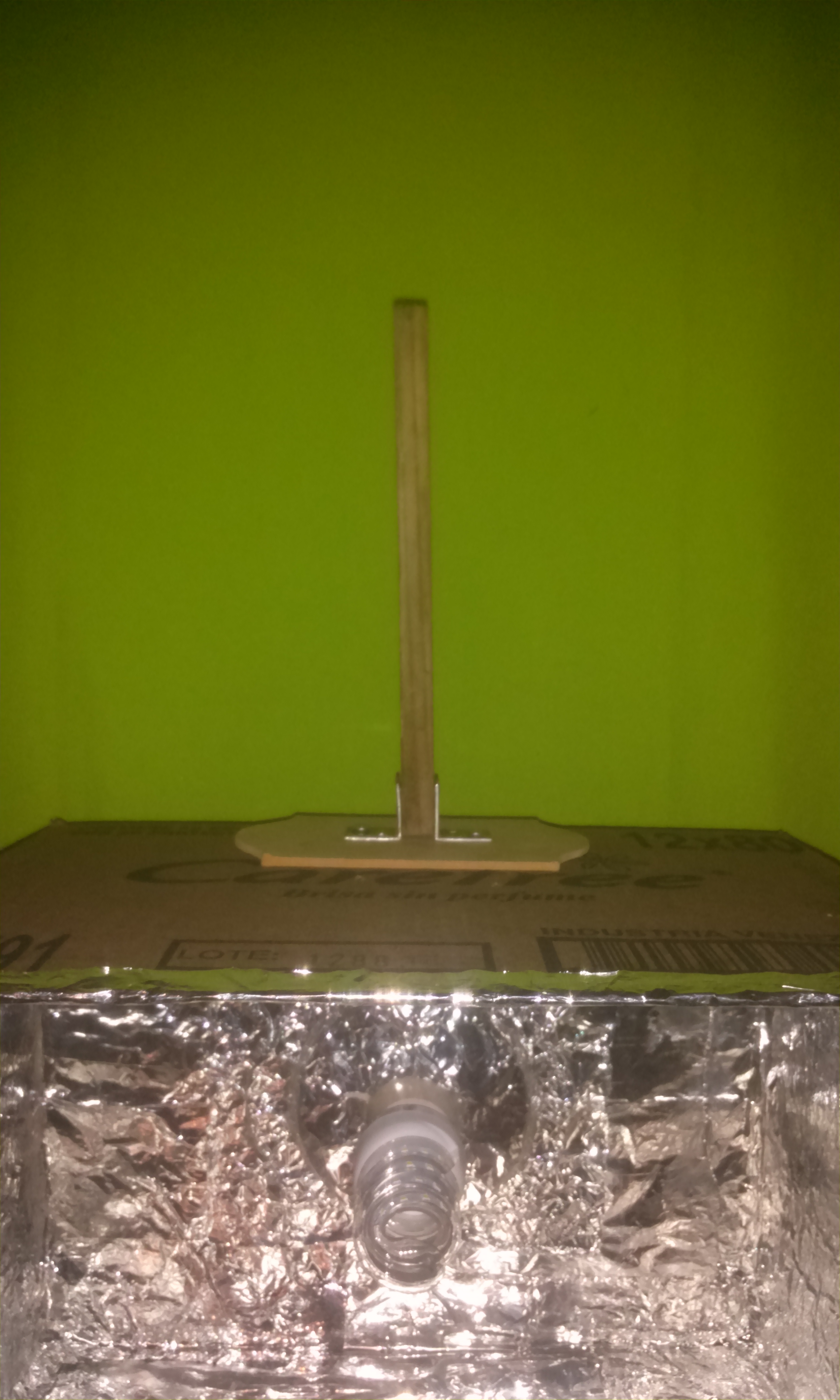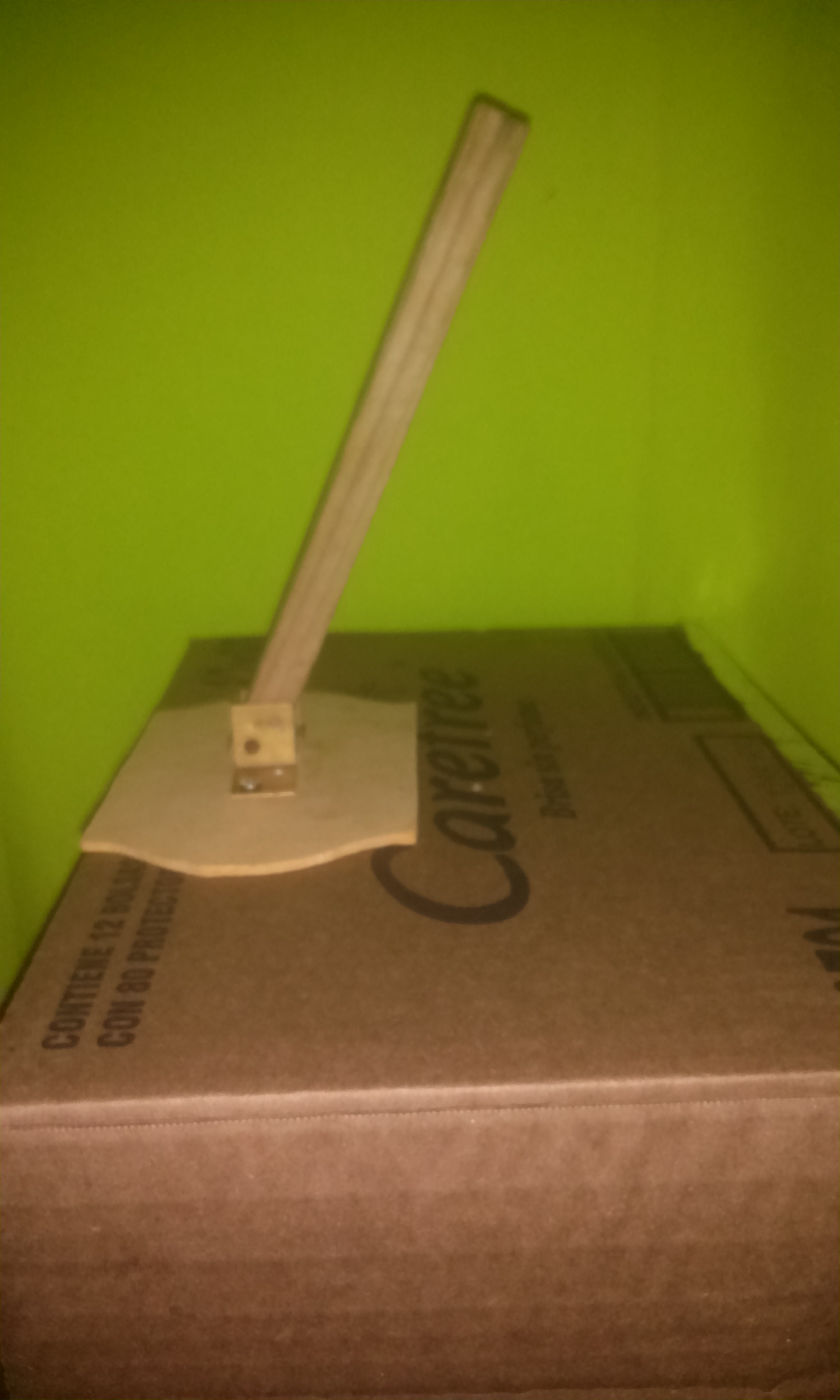 6). Para hacerlo mas firme y que tenga un soporte, coloqué dos laminas más en uno de los laterales de la caja y les coloque un palito para poder encajarlo en un paral y tuviese más funcionalidad: