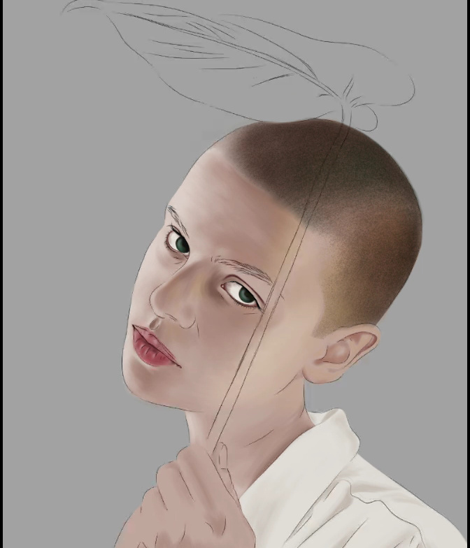 El cabello rapado fue un poco dificil de elaborar, este proceso lo hice con el pincel aereografo partículas, agregando varias capas en distintos tonos de color