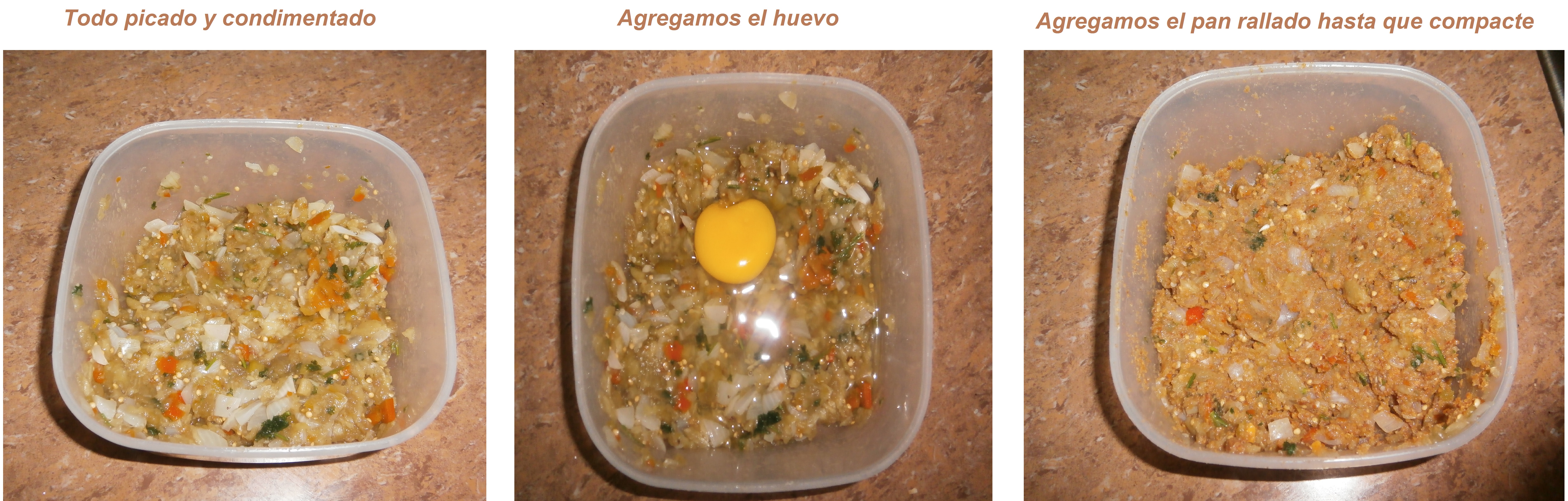 Juntamos todo lo que picamos y vamos agregando los condimentos y el huevo, revolvemos un poco, agregamos el pan rallado, yo reservé un poco de perejil y 3 dientes de ajo machados para agregarlos acá, revolvemos una vez más y recomiendo que llevemos esta mezcla a la nevera por al menos una hora para que esté más compacta.