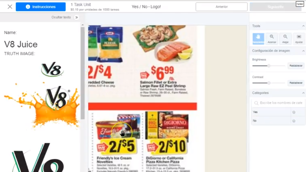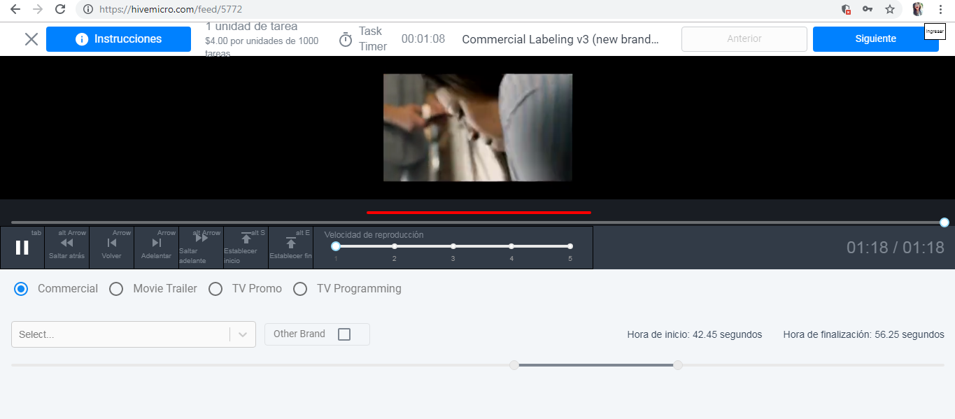 Seguí entrando diariamente, al cabo como de una semana me salió una tarea nueva llamada Commercial Labeling V3, yo soy una persona que es un poco visual, me gusta observar. Esa tarea se está pagando 1000 tareas x $4 , me metí allí y vi como era, debía categorizar los vídeos que la página te daba, como comerciales, tráiler de películas, programas de TV.