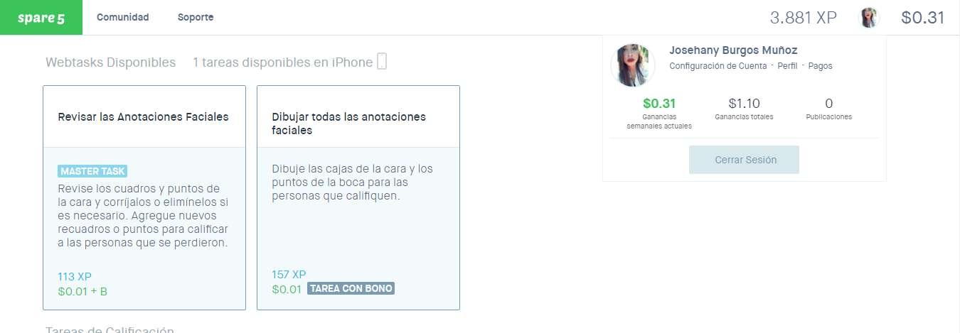 Bueno chicos, ahora sí les cuento, la primera página que intenté se llama Spare5, estaba allí pero todavía seguía como agnóstica, no creía nada de eso pero como tampoco era que tenía mucho que perder. Entraba diariamente, había días que no habían tareas, al cabo de una semana llegué al mínimo de cobro que fue $1, realmente me quedé sorprendida al ver el dinero en mi monedero, sin embargo no quise seguir allí ya que me costó una semana hacerlo y yo me sentía que eran muy pocas las tareas, así que muy pronto tiré la toalla con esa página.