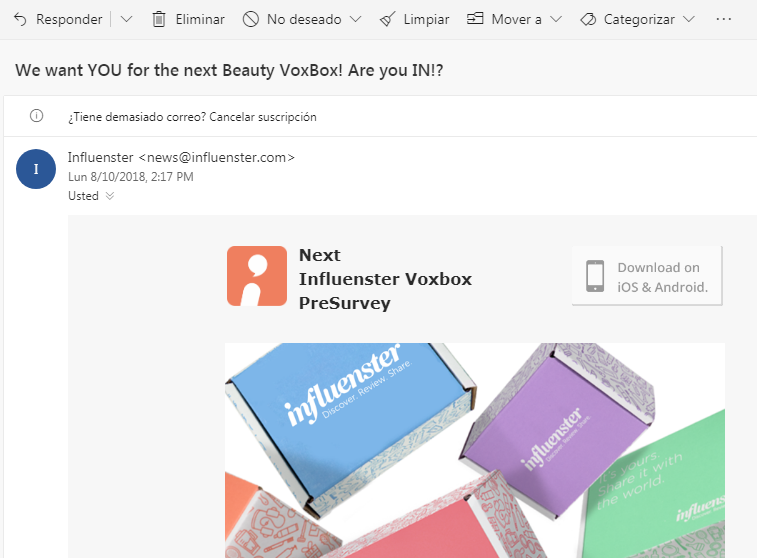 Influenster cada mes envía cajas con productos, me parece que mayormente son de maquillaje, aunque también envían otras cosas. Bueno, en base a los datos que tú has ido dando en las encuestas, ellos recolectan esa información y si se adaptan esos productos a ti ellos vía correo te enviaran una notificación que dice lo siguiente