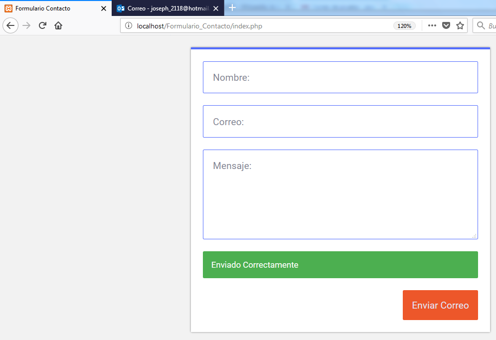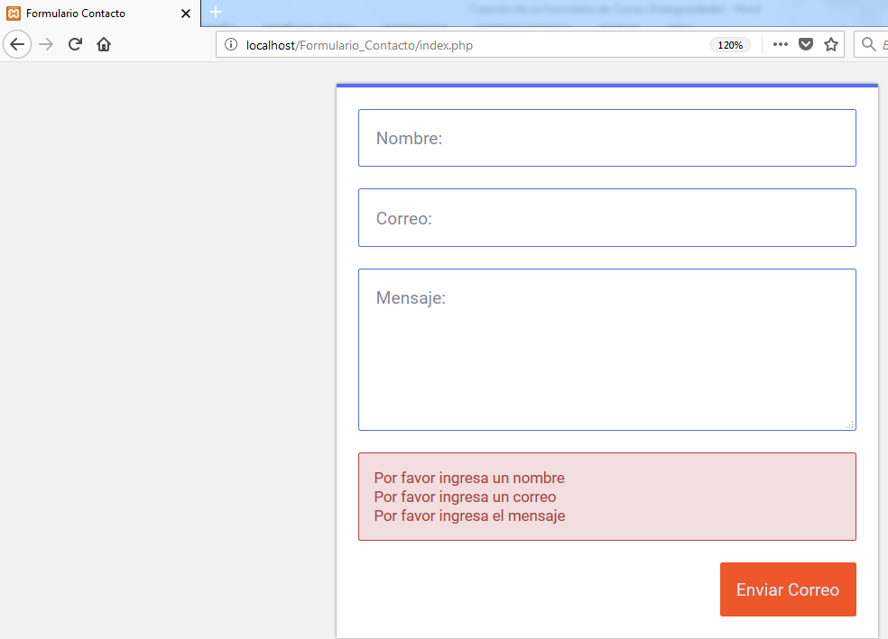 Luego que realizamos todo esto abrimos nuestro navegador web, colocamos en la url la siguiente dirección: http://localhost/Formulario_Contacto/. Y observamos cómo va quedando nuestro formulario.