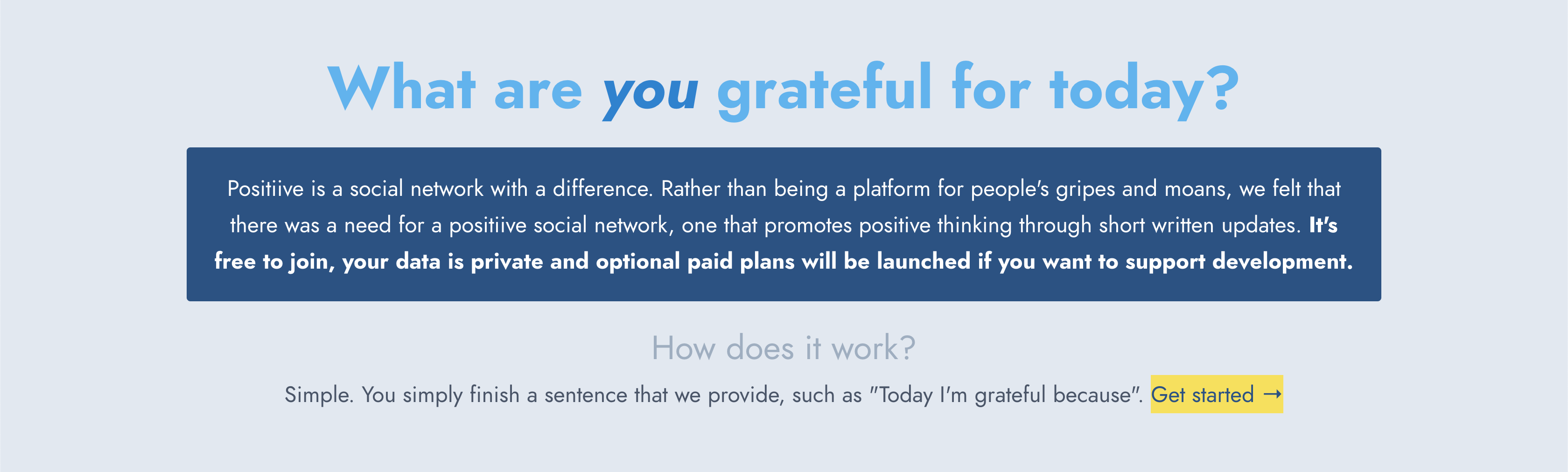 Los medios sociales pueden ser un círculo de negatividad y, francamente, estamos hartos de verlo. Las personas han perdido el contacto con lo que es bueno en sus vidas y es por eso que han creado Positive. Es una red social que se centra en la alegría de tu vida.