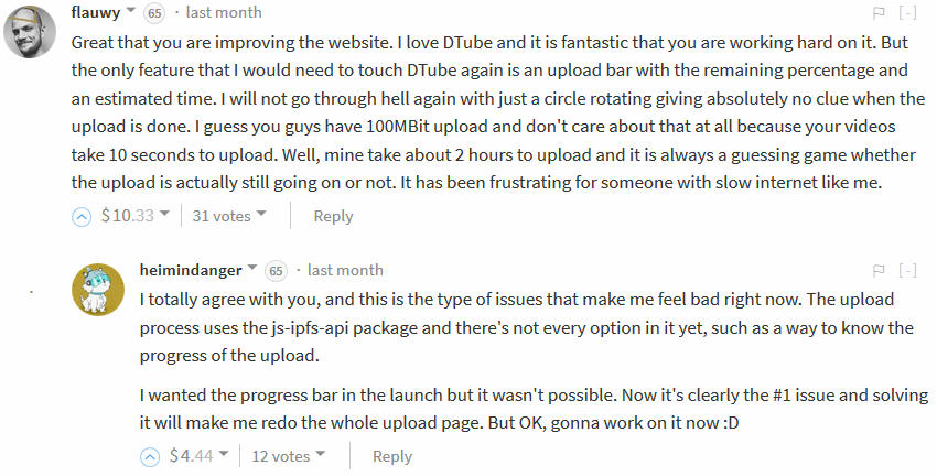 Genial que estés mejorando el sitio web. Me encanta DTube y es fantástico que estés trabajando duro en él. Pero la única característica que necesitaría para volver a tocar DTube es una barra de carga con el porcentaje restante y un tiempo estimado. No volveré a pasar por el infierno con sólo un círculo girando sin dar absolutamente ninguna pista cuando se hace la carga. Supongo que tenéis 100MBit de carga y no os importa en absoluto porque vuestros vídeos tardan 10 segundos en cargarse. Bueno, la mía tarda unas 2 horas en subir y siempre es un juego de adivinanzas si la carga está realmente en marcha o no. Ha sido frustrante para alguien con lenta Internet como yo.