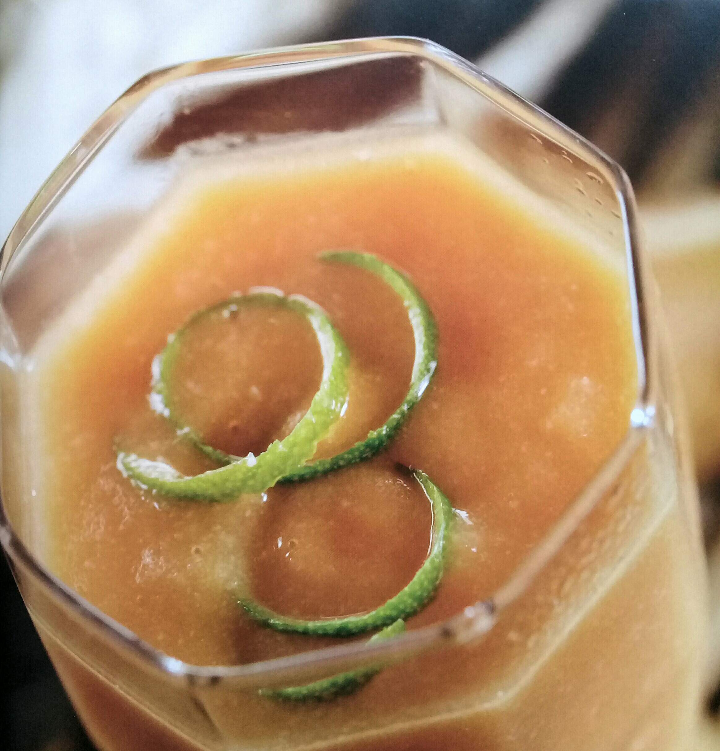 Mezcle todo muy bien. Sirva en vasos grandes coronados con la cáscara del limón.
