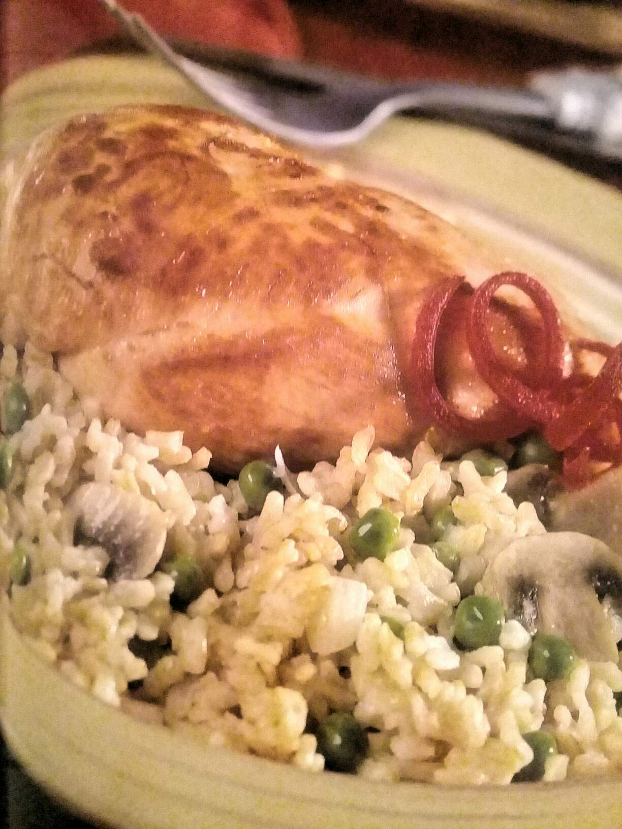 - Integre los champiñones, la cebolla, los chicharos (guisantes) y el arroz. Añada el pollo, tape y cueza a temperatura baja por 5 minutos o hasta que el pollo este bien cocido. Deje reposar durante 5 minutos.