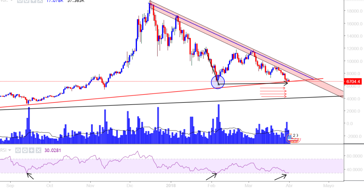 ⏩Otra situación a la que habrá que prestar atención es el soporte que genera el anterior mínimo. La ruptura a la baja de dicho soporte podría ser muy veloz debido a la acumulación de stops. Un factor que nos pueda indicar una subida lo encontramos en el RSI. A punto de mostrar sobreventa, punto de entrada en largo para muchos traders.