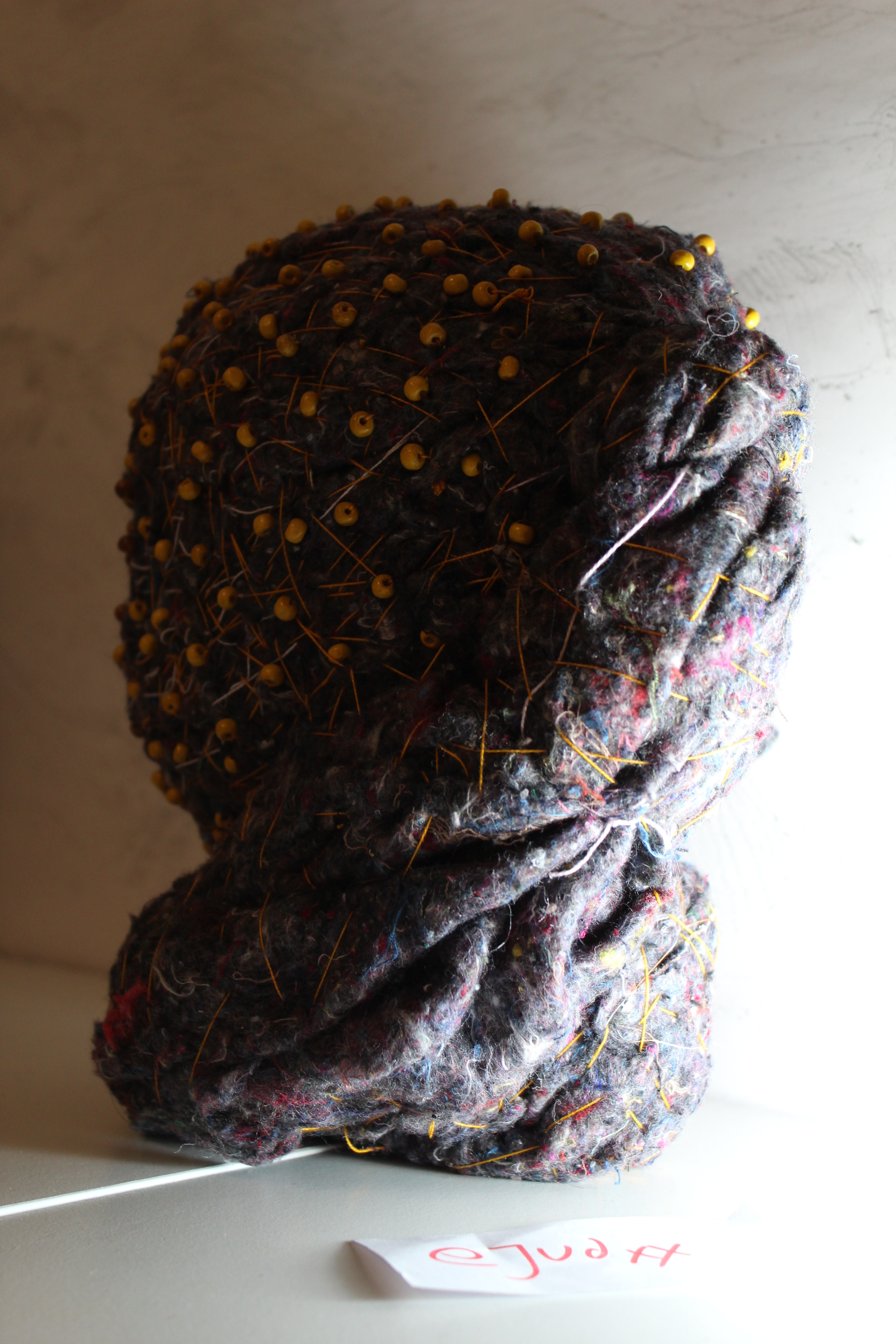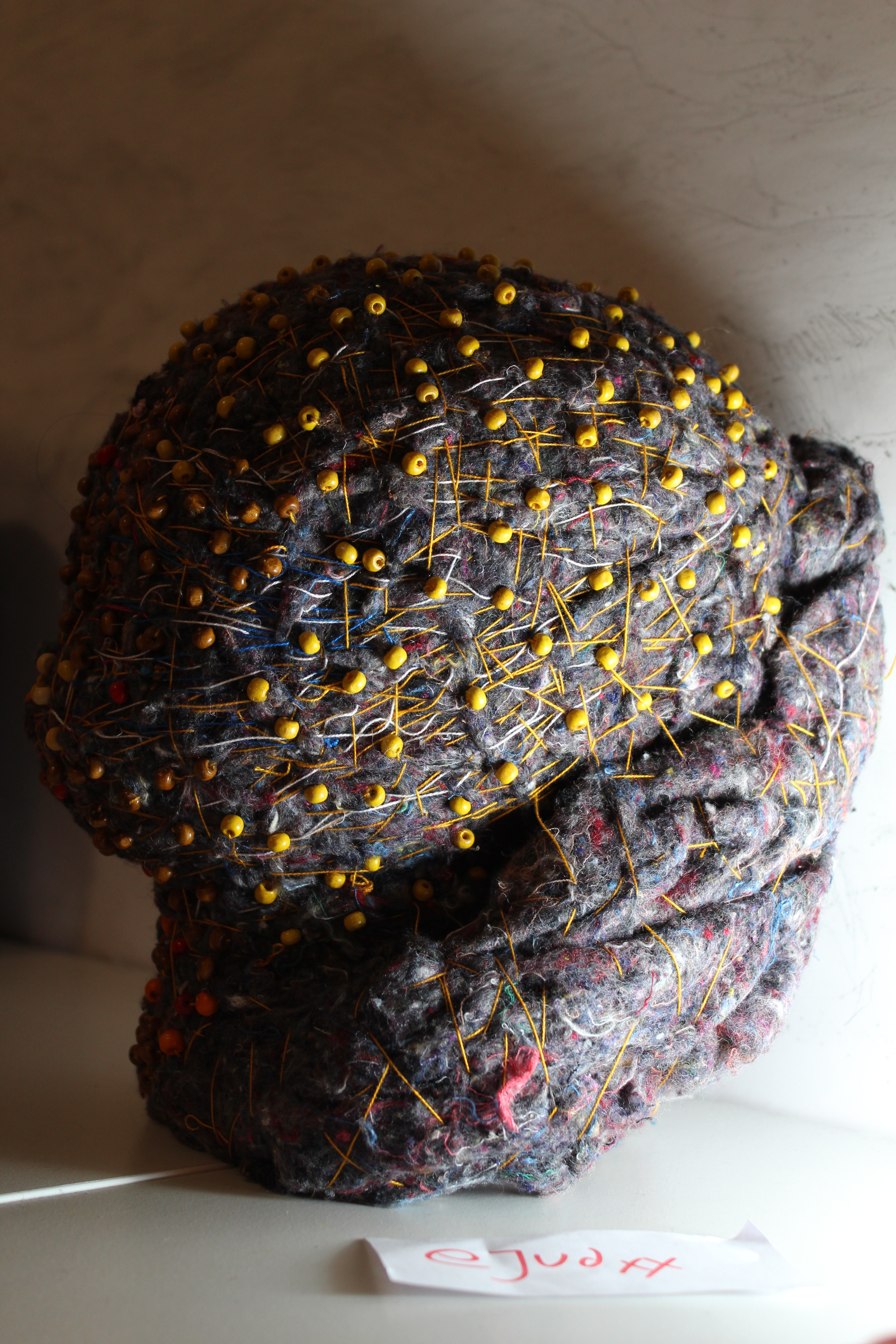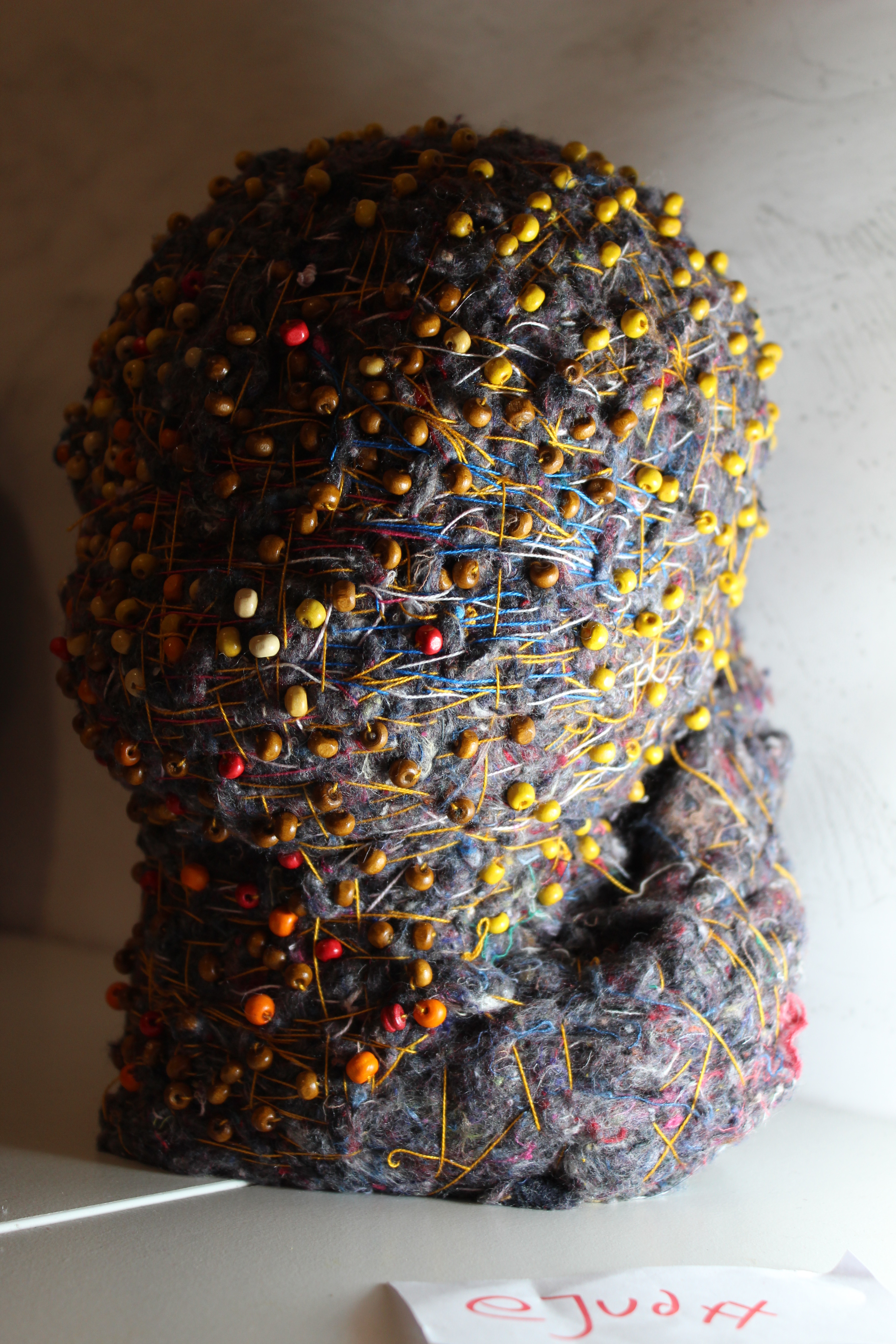 La cabeza pertenece a la serie "lo que no se dice", 2019. materiales usados. tejidos, hilos, lanas, botones, plásticos, etc. La pieza es de mi autoría y las fotos las tomé con una Canon EOS 1300D, sin retoque fotográfico. y la última con un viejo Xiaomi.
