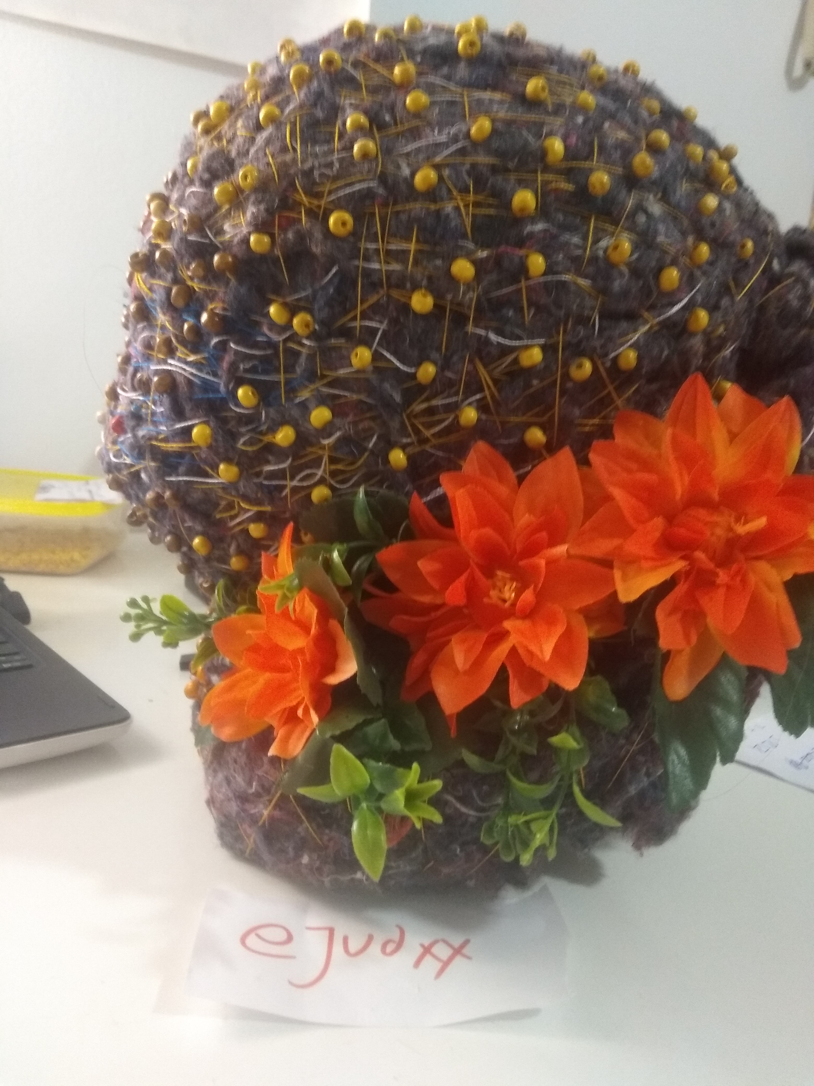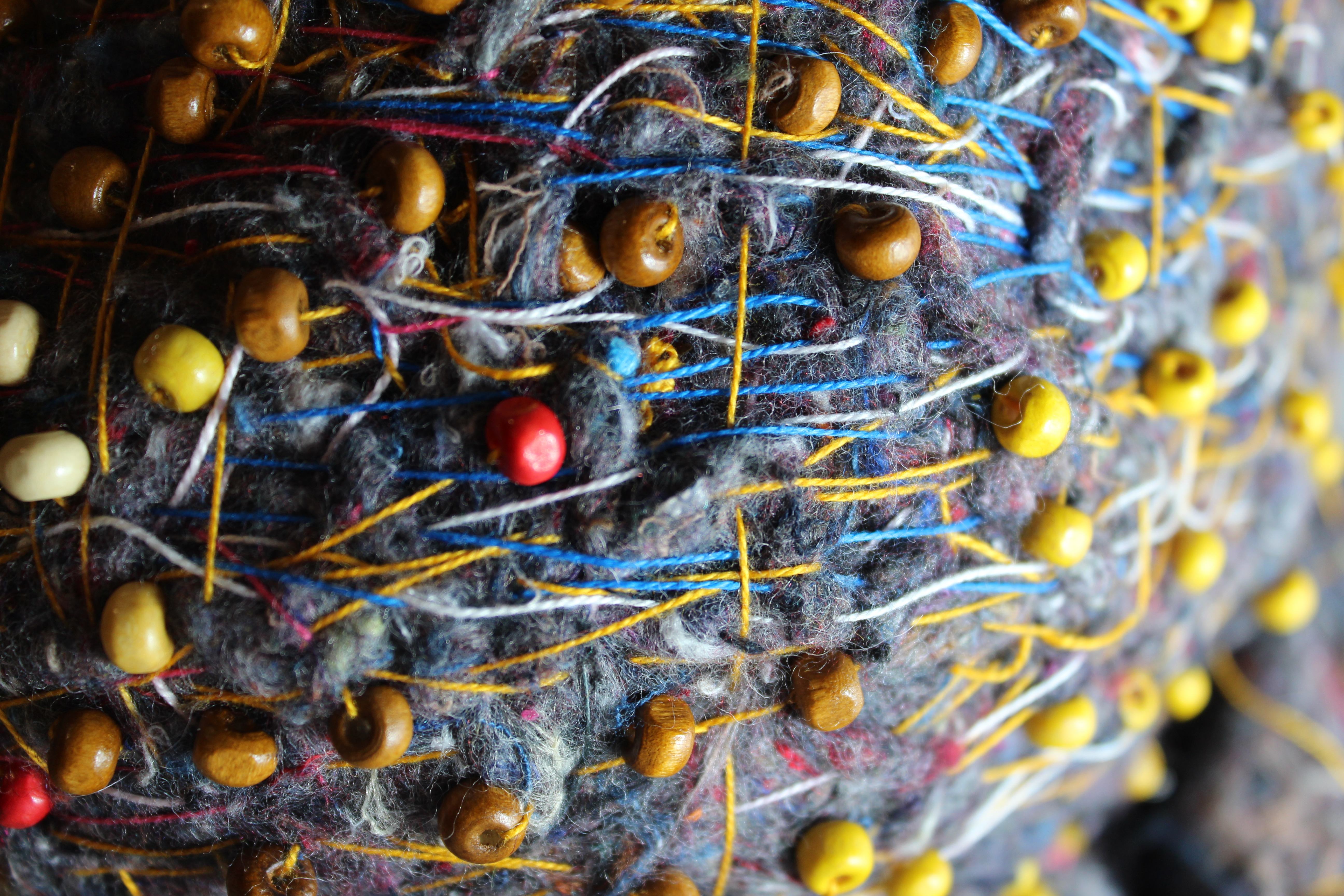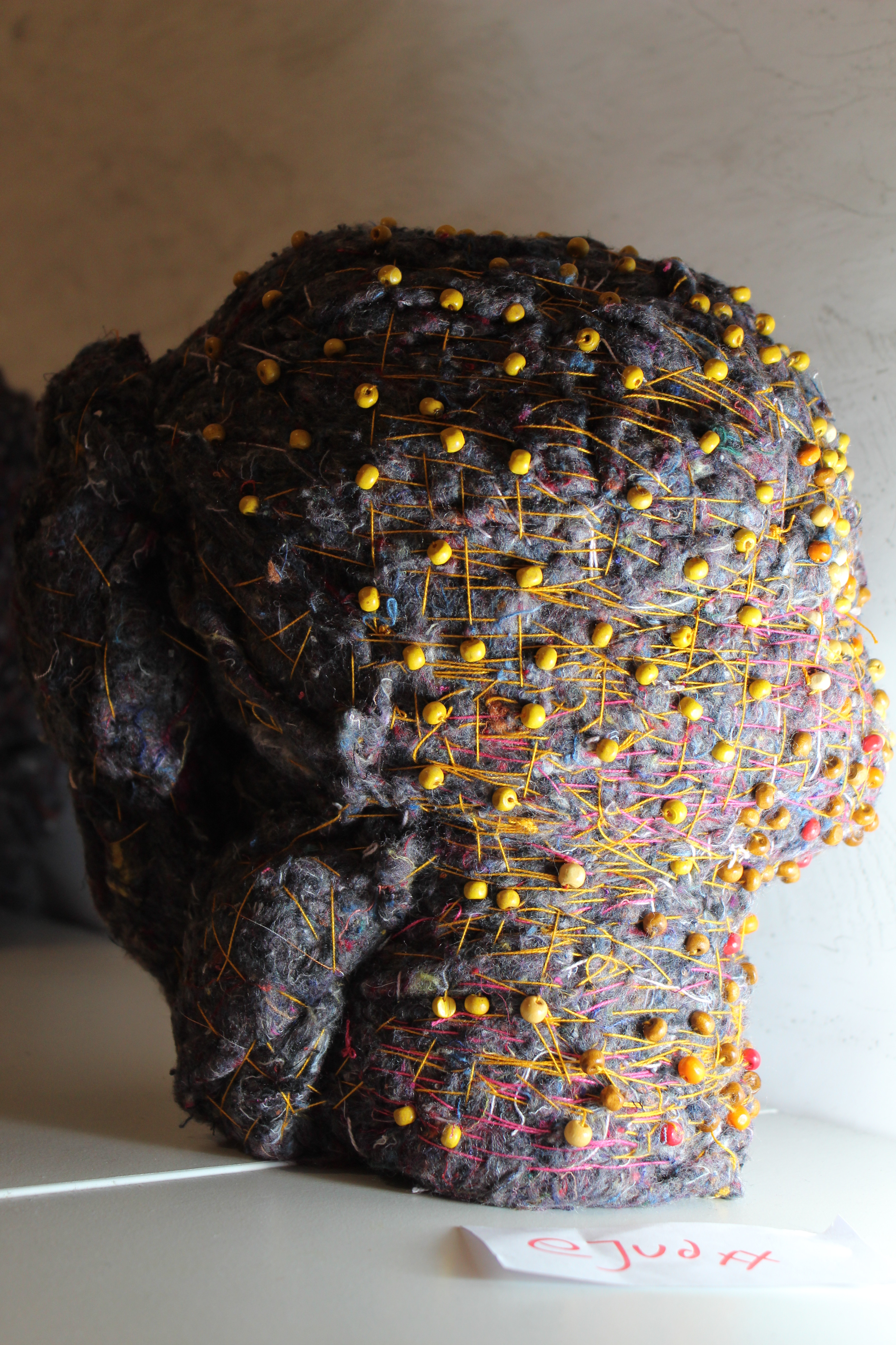La cabeza pertenece a la serie "lo que no se dice", 2019. materiales usados. tejidos, hilos, lanas, botones, plásticos, etc. La pieza es de mi autoría y las fotos las tomé con una Canon EOS 1300D, sin retoque fotográfico. y la última con un viejo Xiaomi.