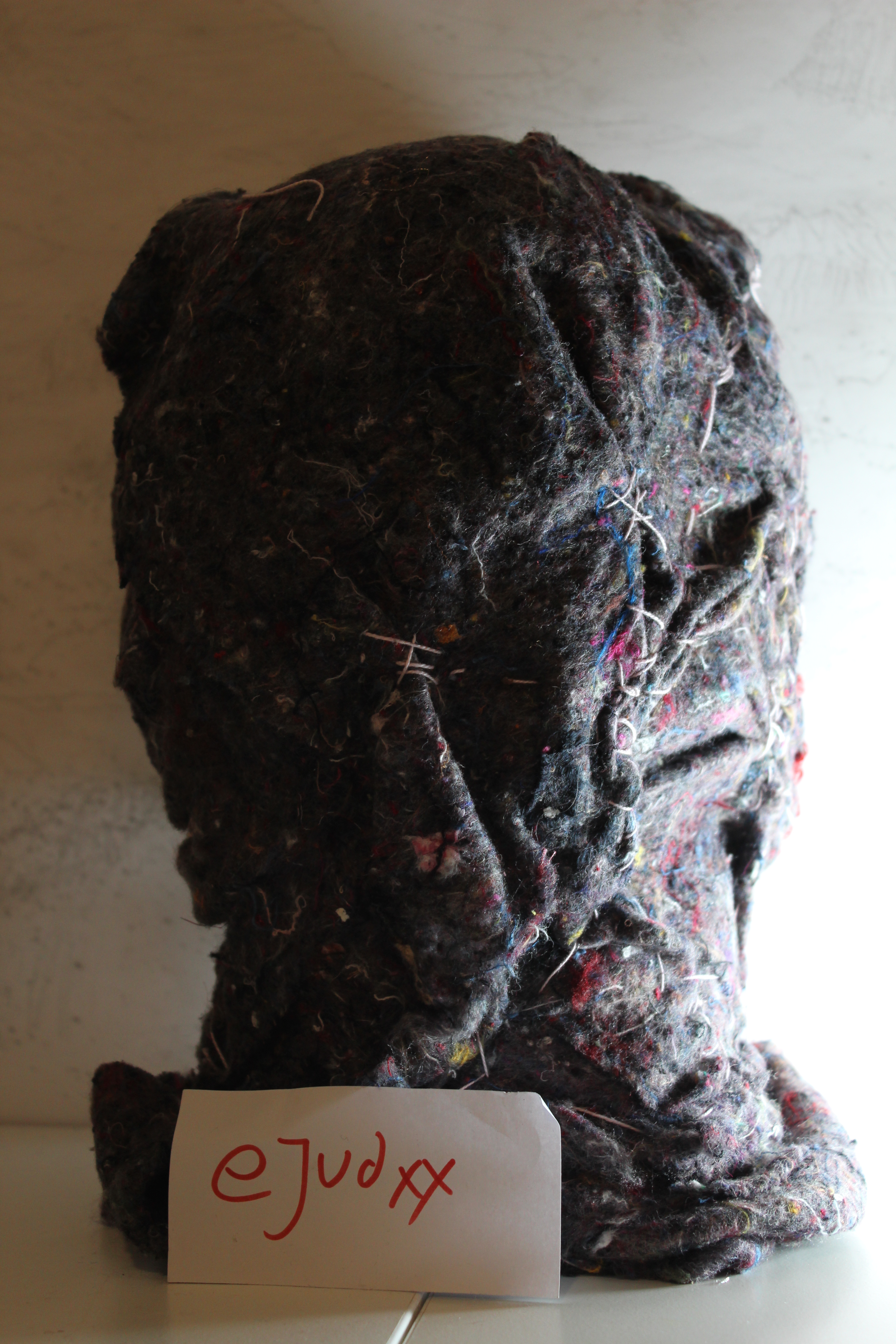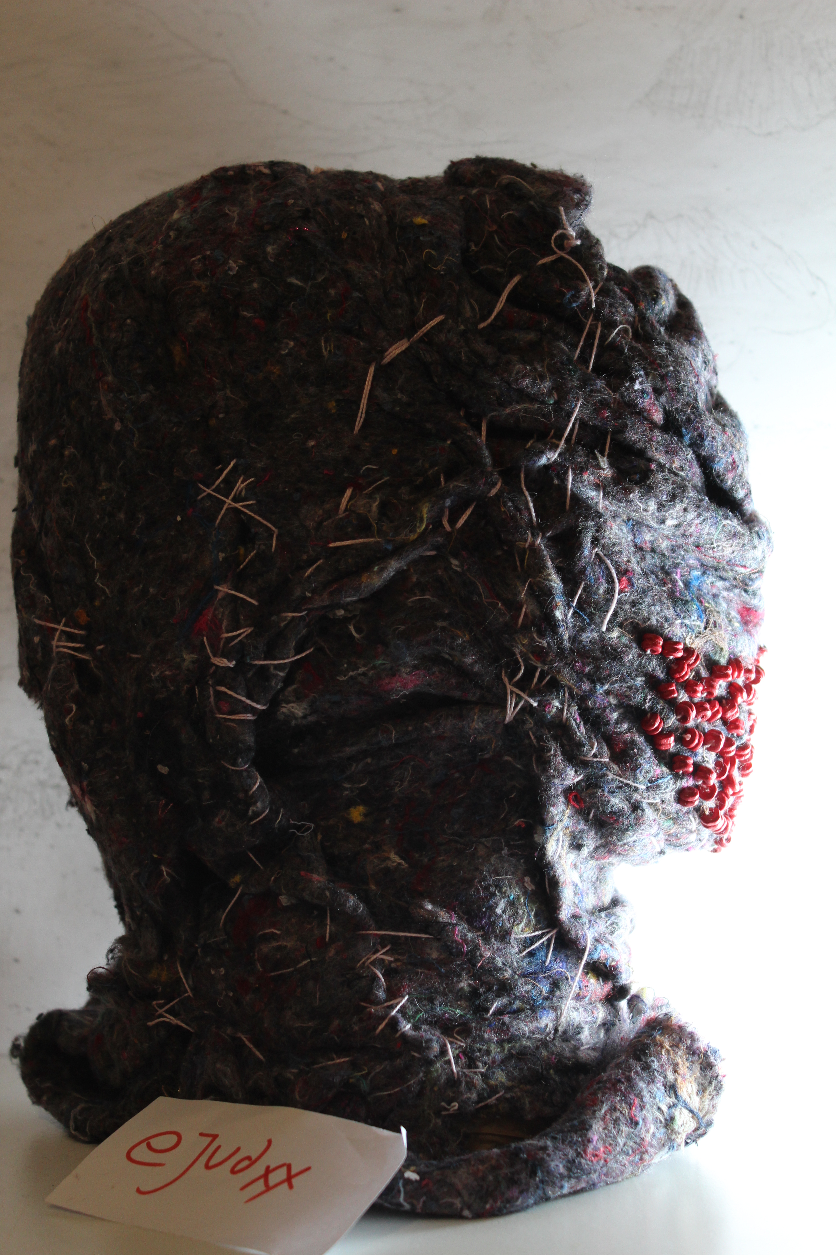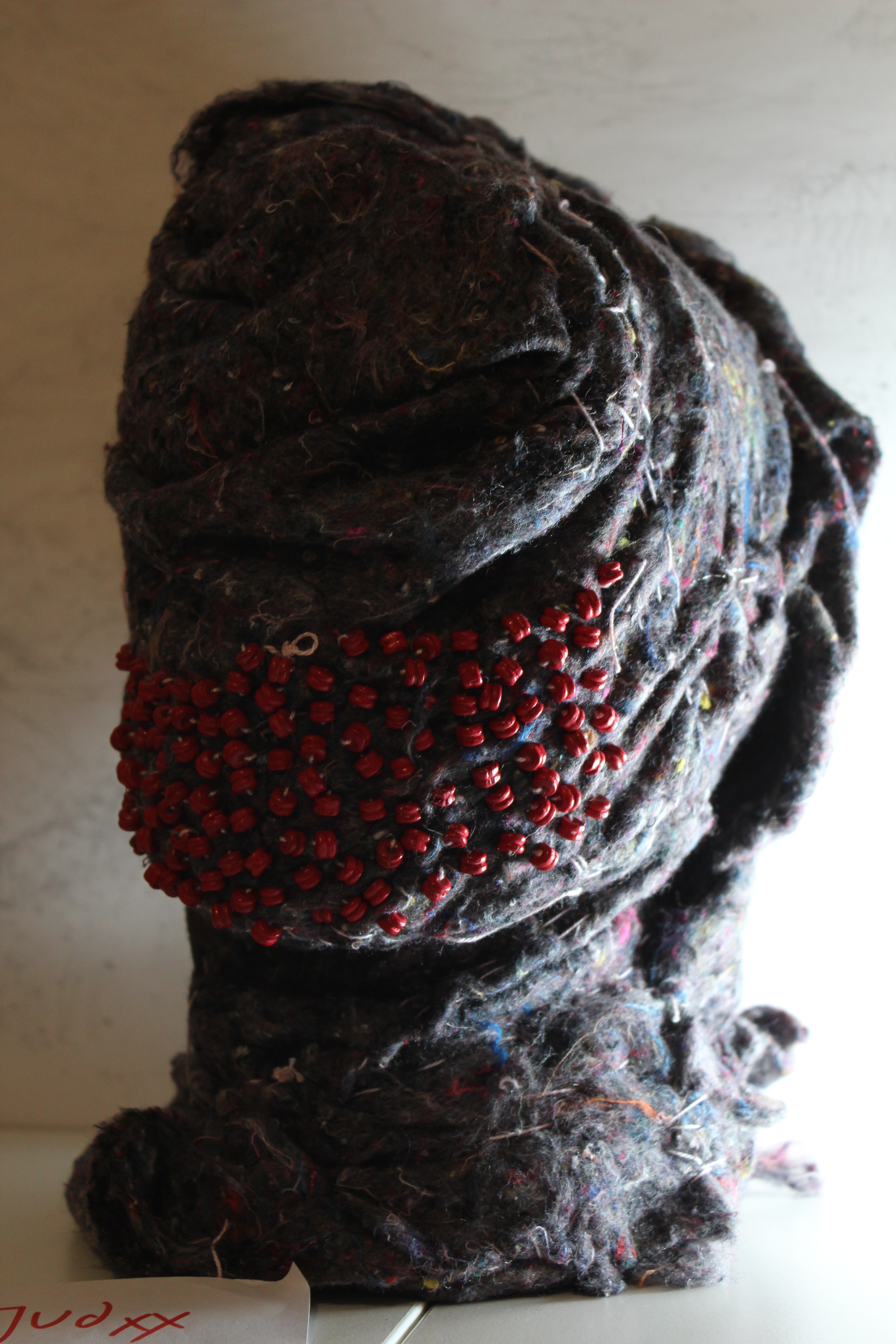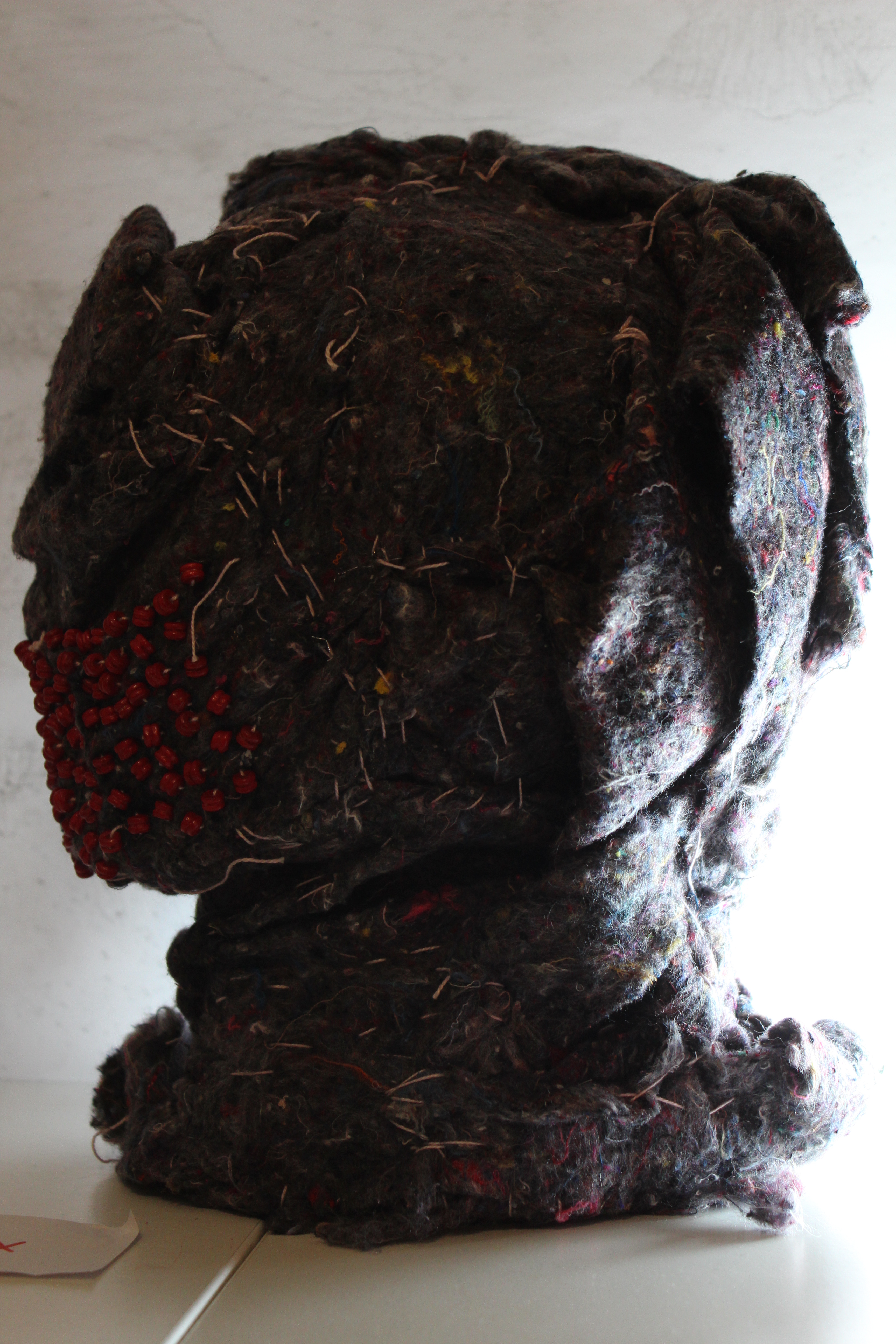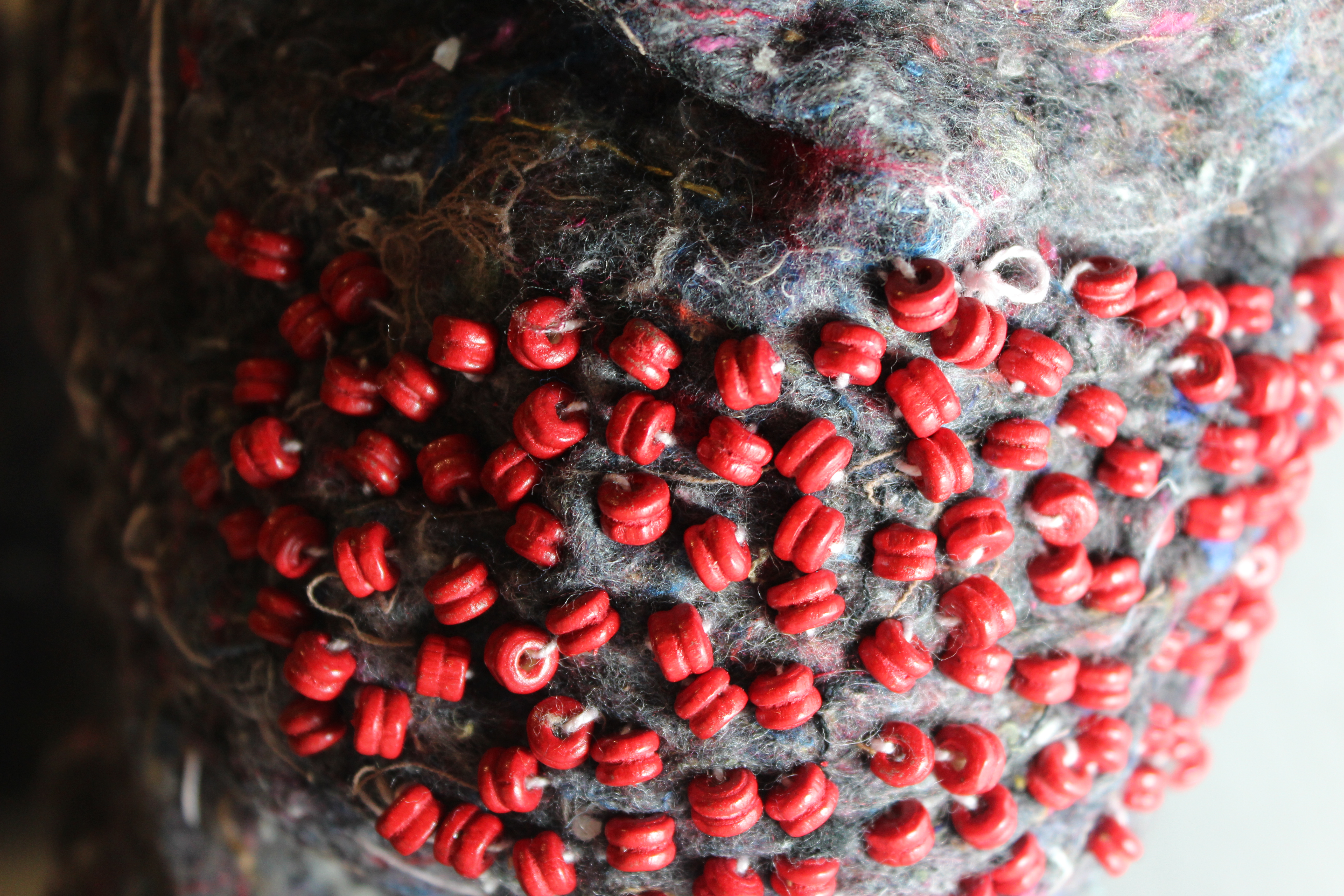 Tejidos reciclados, lanas e hilos y mostacillas. la base rígida está hecha con PVC.