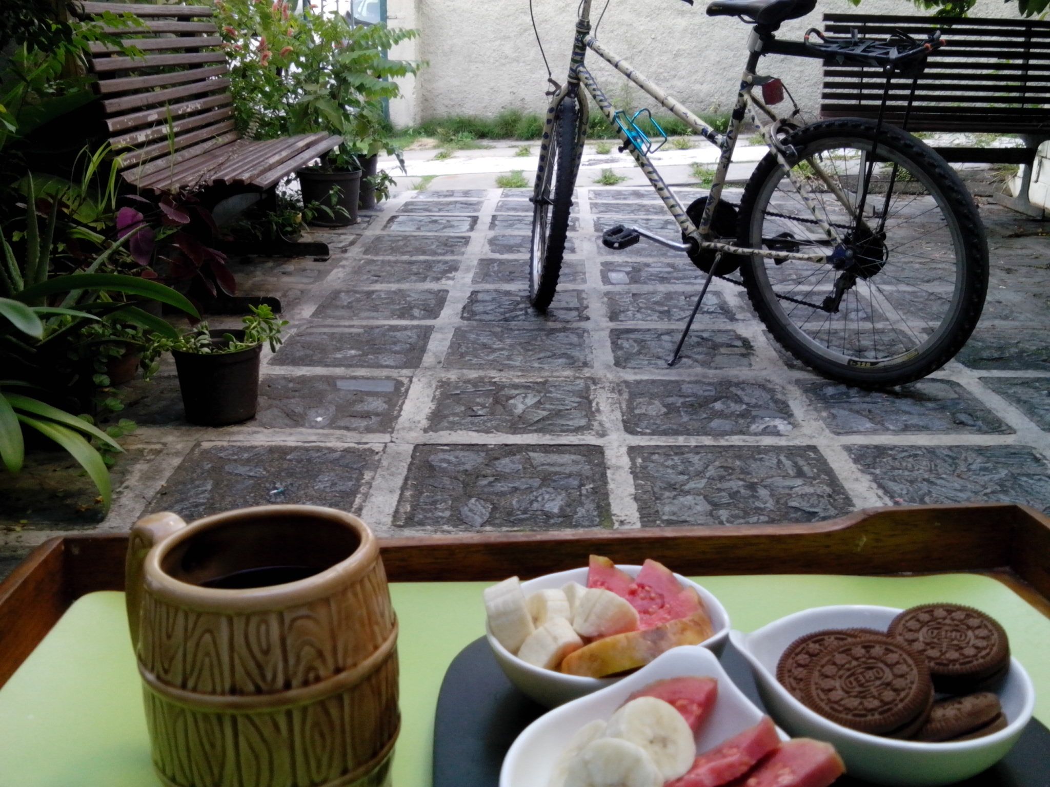 | De regreso en casa, una infusión caliente, galletas y frutas, hacen mi merienda preferida de todas las tardes. Todo sigue tranquilo, hay mucha paz y tranquilidad del domingo que todavía puedo disfrutar desde mi jardín. |