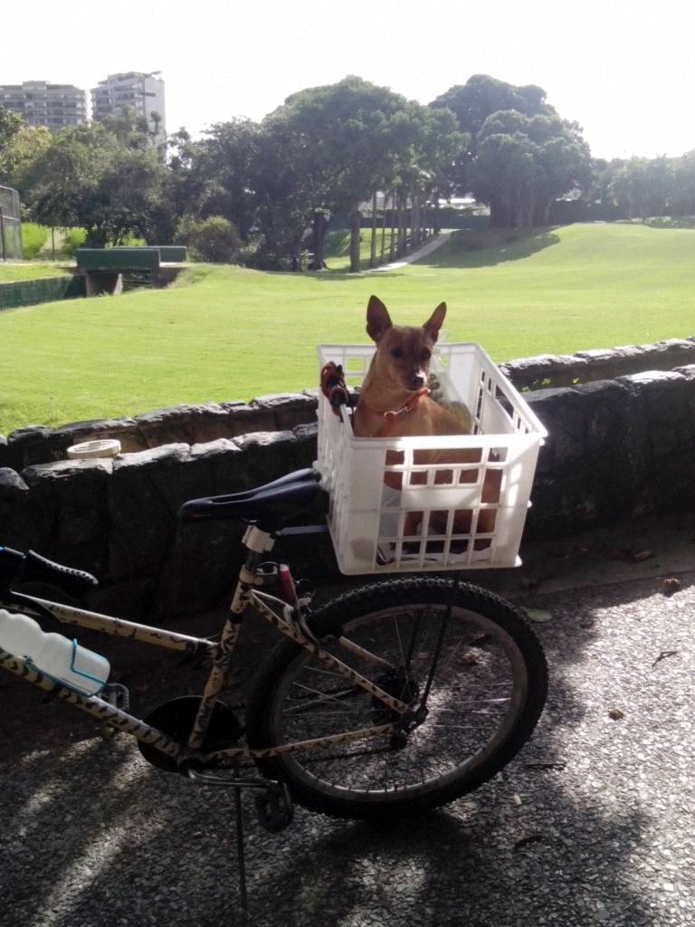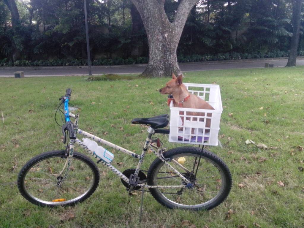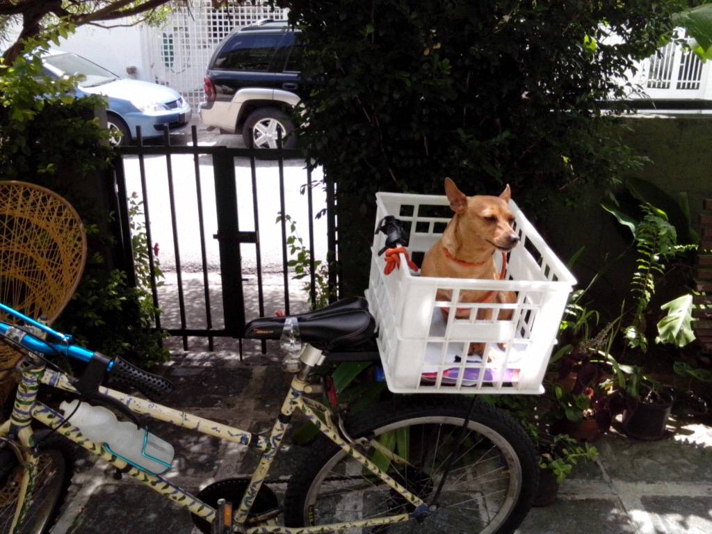De acá tuvimos que salir rápido :(.. Unos gatos traían loca a Samy y no se quedaba quieta. Ahora ya saben por qué en todas sus fotos sale montada en su cesta. Ella luce muy tranquila, pero al ver un gato o cualquier otro perro... chanchanchaaaaaannn...