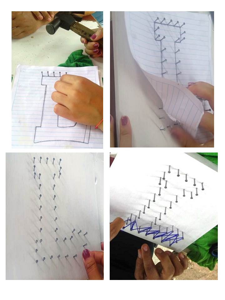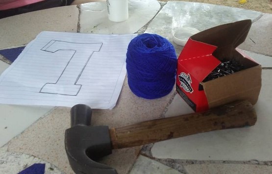 Una vez tengamos la plantilla en papel, la fijamos con un poco de cuidado sobre nuestra tabla o soporte, luego comenzamos a clavar los clavos siguiendo el contorno del dibujo que hayamos elegido, me recomendaron que la distancia entre cada clavito es de aproximadamente 1 cm. Luego, retiramos todo el papel o la plantilla (incluidos los restos pequeños que se resisten).