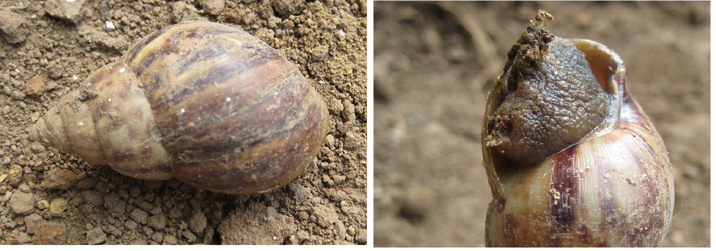 The African snails are different from the native ones because of their shell, especially when they are big, the Africans have horizontal stripes of brown, pink, whitish and yellowish color, and when they are babies they do not have a line, they are freckles, we have to be very aware of these details.