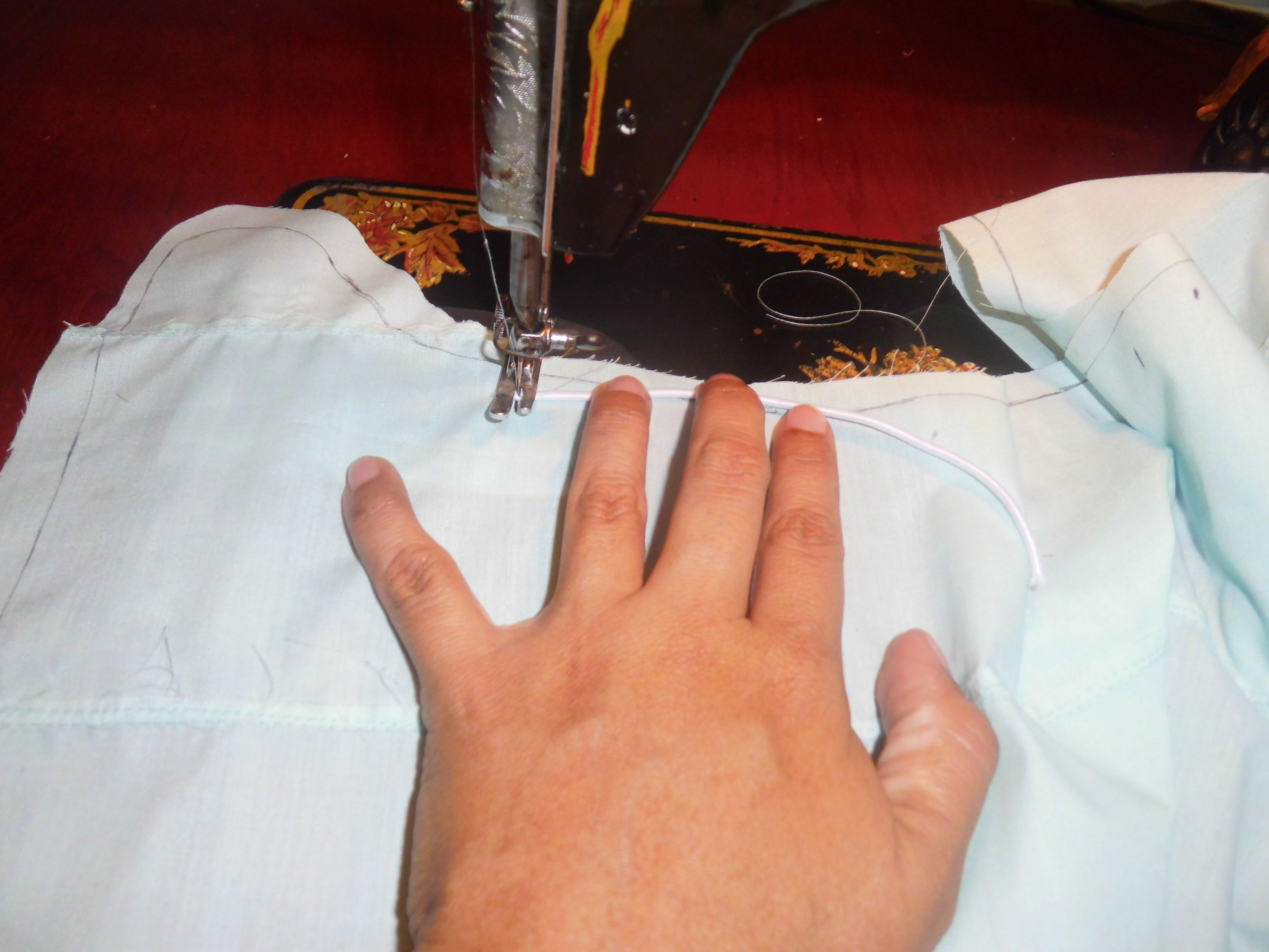Cosemos a la tela unicolor la goma que ayudara a sujetar el pañal al bebe, esa que va en las piernas y cintura