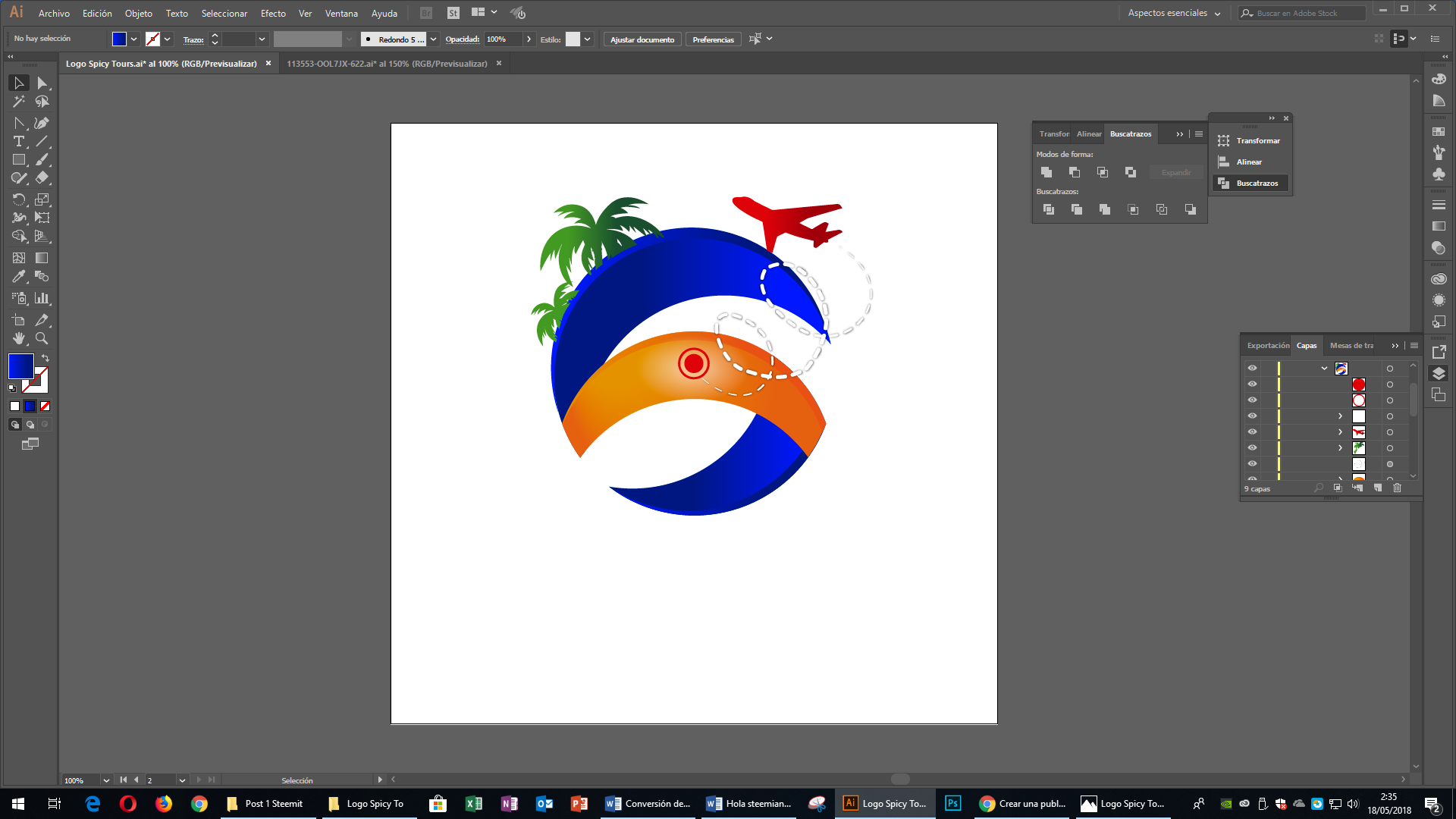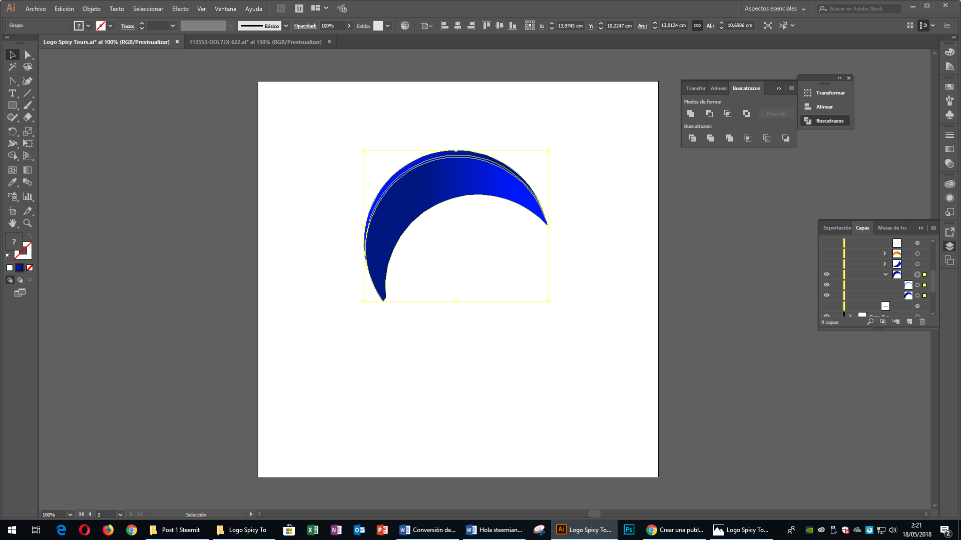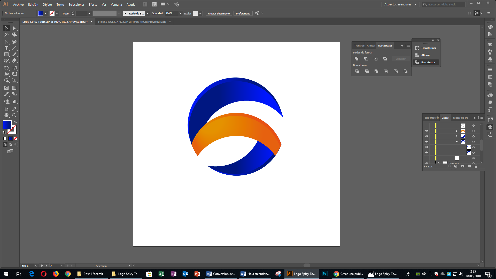 Primero comencé por abrir el programa Illustrator, coloqué un lienzo de 20 x 20 cm y empecé a trazar círculos, dando forma a la base de una letra S, con la herramienta menos frente del panel buscatrazos, corté los círculos unos con otros y luego agregué color degradado.