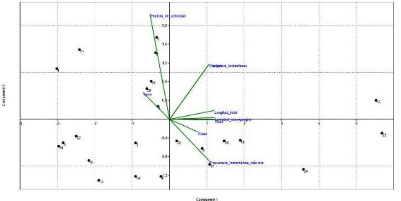Finalmente, se observa la distribución tanto de los casos como de las variables con respecto al origen (figura 4), el CP1 posee la mayor parte de la información electrofisiológica y morfométrica evaluada, mientras que el CP2 se refleja principalmente la resistencia del sistema ante el tratamiento (pudiendo incluso estar asociado a cambios hormonales que disminuyan la robustez de los individuos por el ciclo reproductivo de las hembras). Se cumplió entonces con el objetivo de reducir la dimensión del sistema, en el sentido de que un número grande de variables iniciales, se redujo a dos nuevas variables, denominadas Componentes, que son combinación lineal de las originales. La reducción no supone en ningún caso pérdida de la información relevante proporcionada por las primeras variables. Este método se puede usar para realizar estudios multivariantes posteriores, como un Análisis Cluster, o construir un modelo de Regresión utilizando pocos datos dados por los Componentes en lugar de los muchos proporcionados por las variables iniciales.