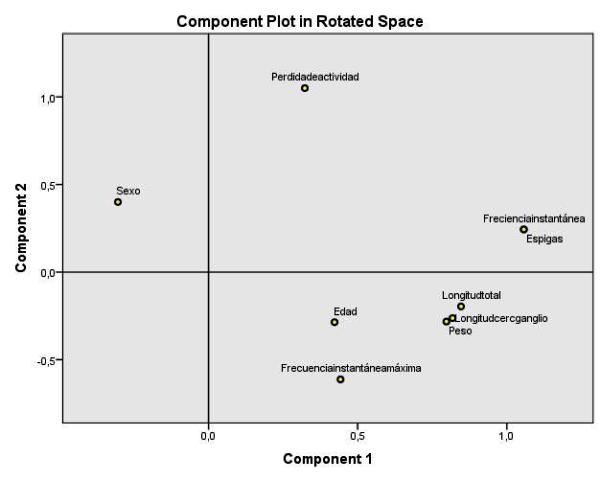 Se observa en la figura 5 poca disminución o pérdida de información sobre la varianza de cada variable en el sistema luego de aplicar el método de extracción. En la región inferior de la figura 6, se puede apreciar que el panel izquierdo y central de la figura muestran la misma situación con respecto a la figura 6, aun así, se observa que luego de la rotación hay un aumento en la cantidad de información retenida por el segundo factor, pasando de un valor total de 1,23 a uno de 3,52. Se dice entonces que se ha encontrado una solución con mayor ajuste de los factores con respecto a cada eje del plano cartesiano. Además se confirmó mediante la matriz componente (método de extracción: ACP) una buena representación asociada a altos valores de correlación de todas las variables exceptuando “pérdida de actividad” en el 1er factor, por otro lado la varianza de esta variable se encuentra bien explicada por el 2do factor.