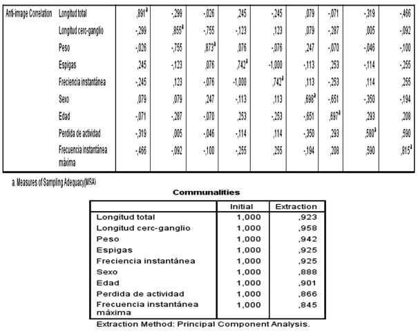 Figura 2. (de arr. a aba.) Matriz anti-imagen. Comunalidades.