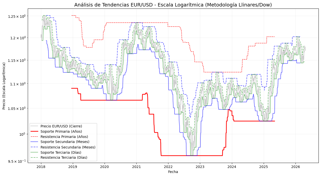 plt.title('Análisis de Tendencias EUR/USD - Escala Logarítmica (Metodología Llinares/Dow)', fontsize=14)