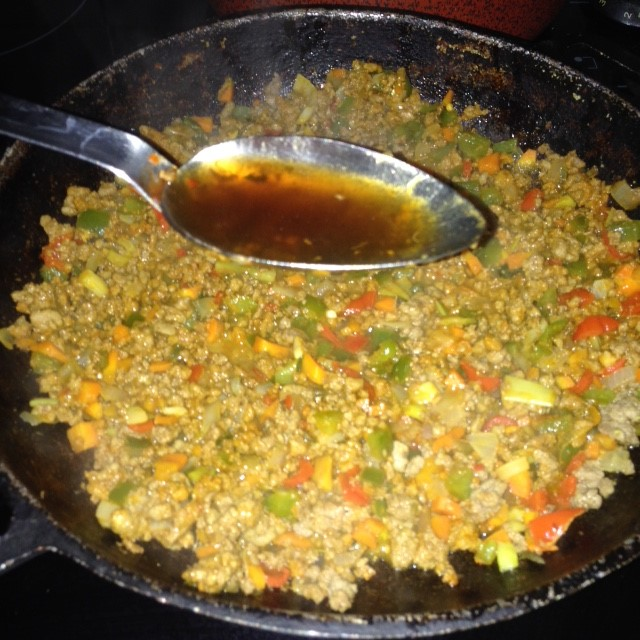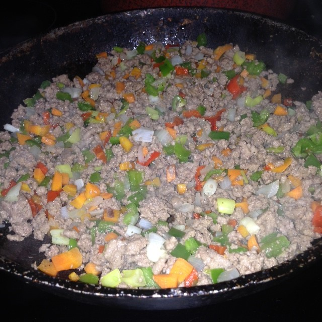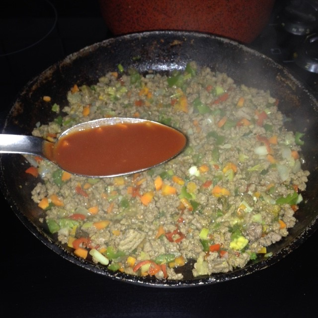 Si observan que el líquido se esta consumiendo, deberán colocar un poquito mas de agua; lo importante es que la carne molida NO se pegue al sartén.