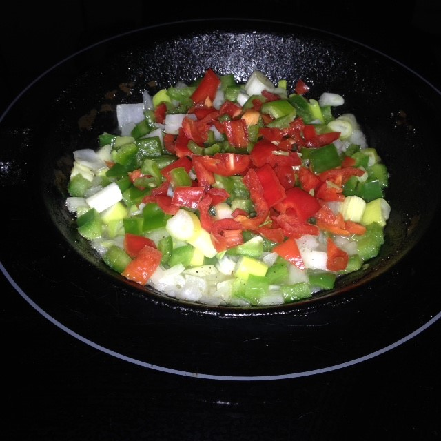 Una vez que la cebolla esta pochada, agregamos los ajíes dulces verdes y rojos.