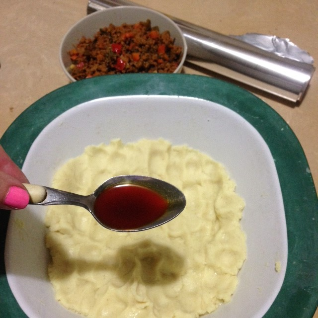 Es el momento de darle color a nuestra masa, para esto le vamos a colocar las 6 cucharadas de onoto líquido; en caso de que lo deseen amarillo oscurito o claro dependerá de la cantidad de onoto que le coloquen; con estas 6 cucharadas les quedará un "amarillo mostaza intermedio" (creo que me acabo de inventar un color jajajá).
