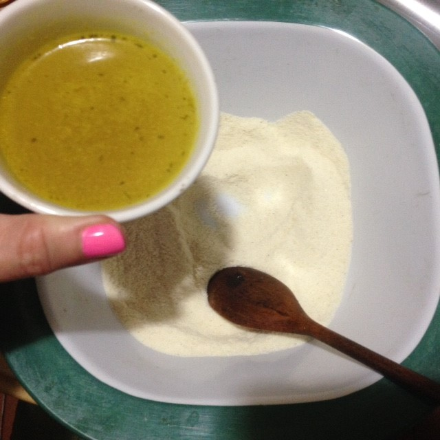 Vamos a colocar la taza de caldo de pollo o carne (con el punto de sal) a la harina, antes deberán entibiar un poquito el caldo.