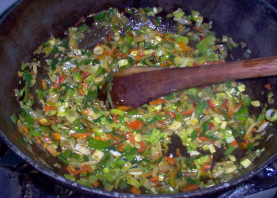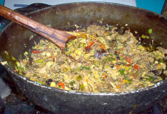 Se coloca en un salten grande a sofreír con aceite con Onoto los dientes de ajos con la cebolla hasta que quede cristalino y después se le agrega los demás ingredientes el Cebollín, Ajo porro, Cilantro Aceituna rellena y por último el pescado mechado hasta que quede el guiso seco.