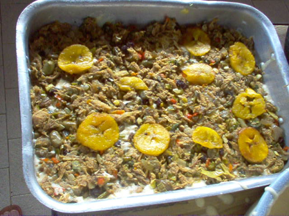 Una vez lista la tortera coloca una capa de guiso del pescado mechado papa y zanahoria en rodajas y de plátano maduro y la mezcla así sucesivamente hasta que llegue el tope de arriba de la tortera una vez llegado al tope coloca una rodaja de plátano maduro para adornar el pastel.