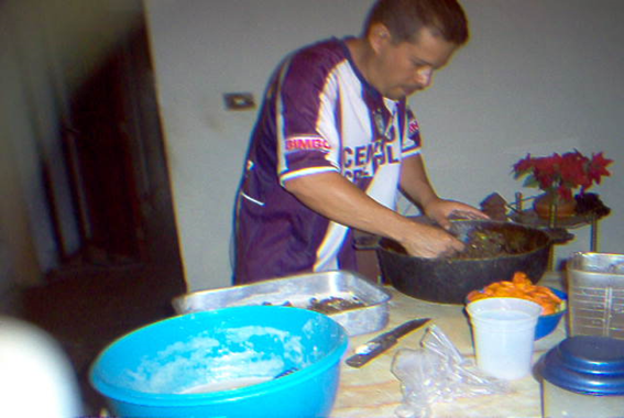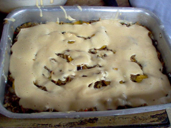 Con una batidora o un batidor manual bates los huevos primero las claras hasta que quede a punto de nieve y después se agregan lo amarillo del huevo y se une con las clara a punto de nieve y se le agrega la harina una cucharada de azúcar y otra de sal se bate hasta que quede una mezcla pastosa como se hace en las tortas normales. Una vez listo el guiso y la Mescla para el relleno se procede trabajar en capas. En una tortera le echas mantequilla y una cucharada harina de trigo para que no se pegue el pastel de la tortera.