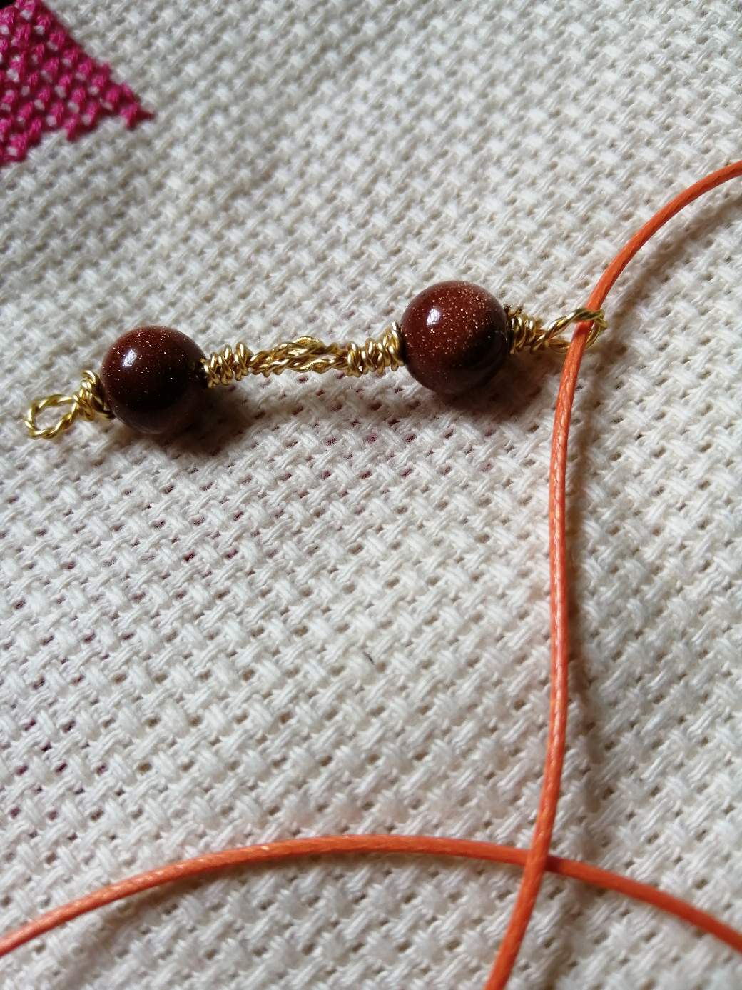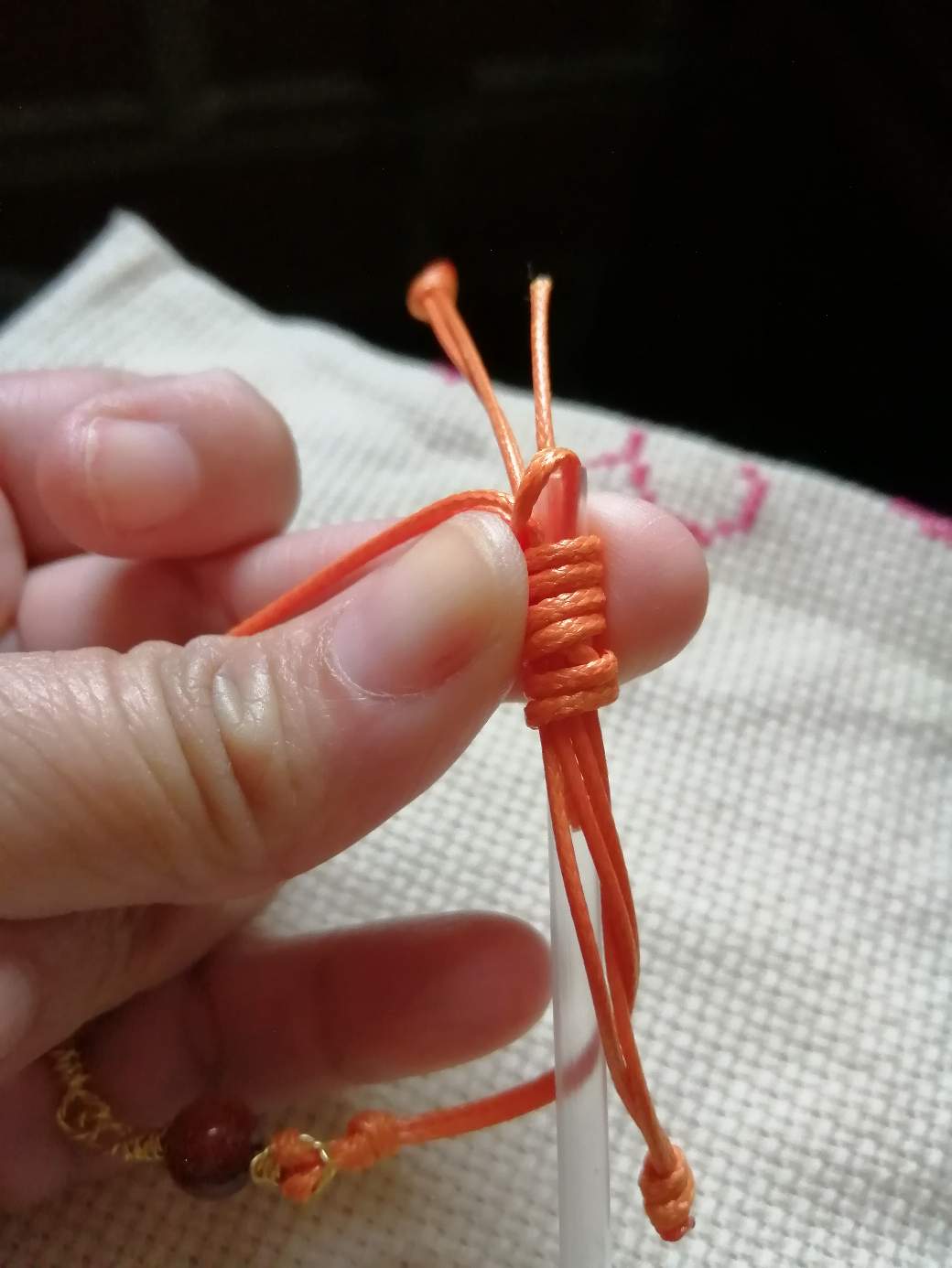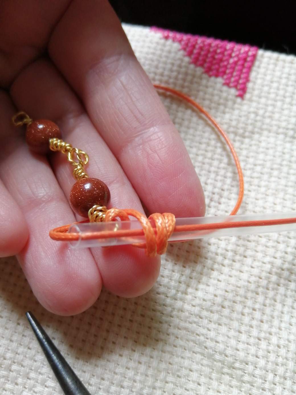 Repetimos la operación del otro lado. Aquí pueden colocarle perlitas o balines y realizar un nuevo nudo para asegurar la pieza.