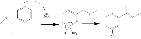 La reacción más importante de los compuestos aromáticos es la sustitución electrofílica aromática. En este tipo de reacción, un hidrógeno del anillo aromático es remplazado por un electrófilo (E+), de ahí el nombre de sustitución aromática electrofílica. Son varios los tipos de sustituyentes que se pueden añadir al anillo aromático, sin embargo, en la práctica se realizara la nitración del benzoato de metilo. En esta reacción se sustituye un hidrógeno por un grupo nitro , que se ubica en posición meta al grupo del éster del benzoato [1].
