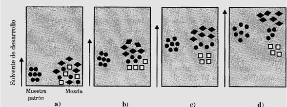En la figura anterior se muestra como se ha sembrado una muestra y el patrón de un posible componente en la parte inferior de la capa adsorbente, Luego se sumerge dicha capa en un solvente de desarrollo, que asciende por capilaridad, desorbiendo selectivamente a los distintos componentes de la mezcla pasando por los estados “a”,” b”,” c” y “d”. Ver figura 3 [3].