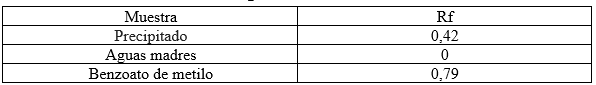 Se presume que se sintetizó con éxito m-nitrobenzoato de metilo debido al color y las características físicas del precipitado que se pudieron apreciar. Entre ellas un olor característico a menta del m-nitrobenzoato de metilo. La cromatografía TLC concuerda con la teoría de capa de adsorción y con la teoría de los factores que afectan la movilidad. De forma que Rf Benzoato de metilo> Rf m-nitrobenzoato de metilo > Rf Aguas madres.