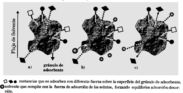 . Al comenzar la elución. Ver figura 4.b, las moléculas de solvente competirán con los solutos por su adsorción en la superficie del gránulo adsorbente. El compuesto