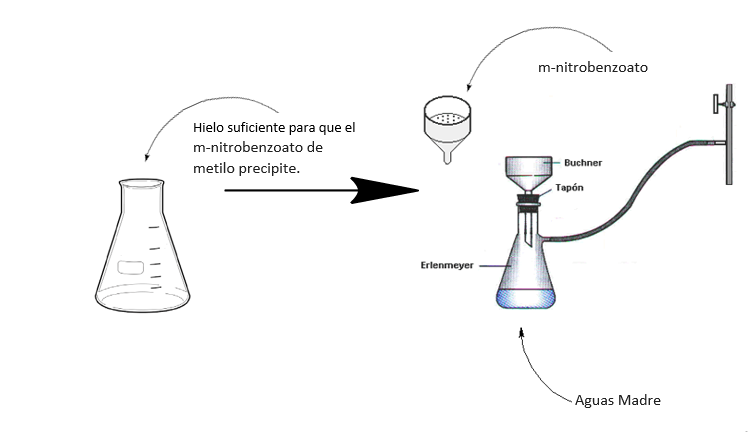 los isómero “orto” y “para” del m-nitrobenzoato de metilo. Estos productos secundarios se eliminan cuando el producto deseado se lava con metanol y se purifica por cristalización. El agua tiene un efecto retardante sobre la nitración porque interfiere con los equilibrios ácido nítrico-ácido sulfúrico que forman los iones de nitronio. Cuanto menor es la cantidad de agua presente, más activa es la mezcla de nitración. Además, la reactividad de la mezcla de nitración puede controlarse variando la cantidad de ácido sulfúrico utilizado. Este ácido