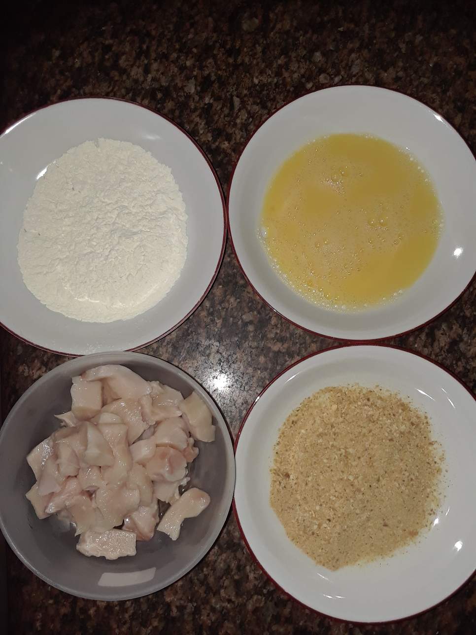 - En platos hondos van a colocar la harina de trigo, el huevo ligeramente batido y el pan rayado.