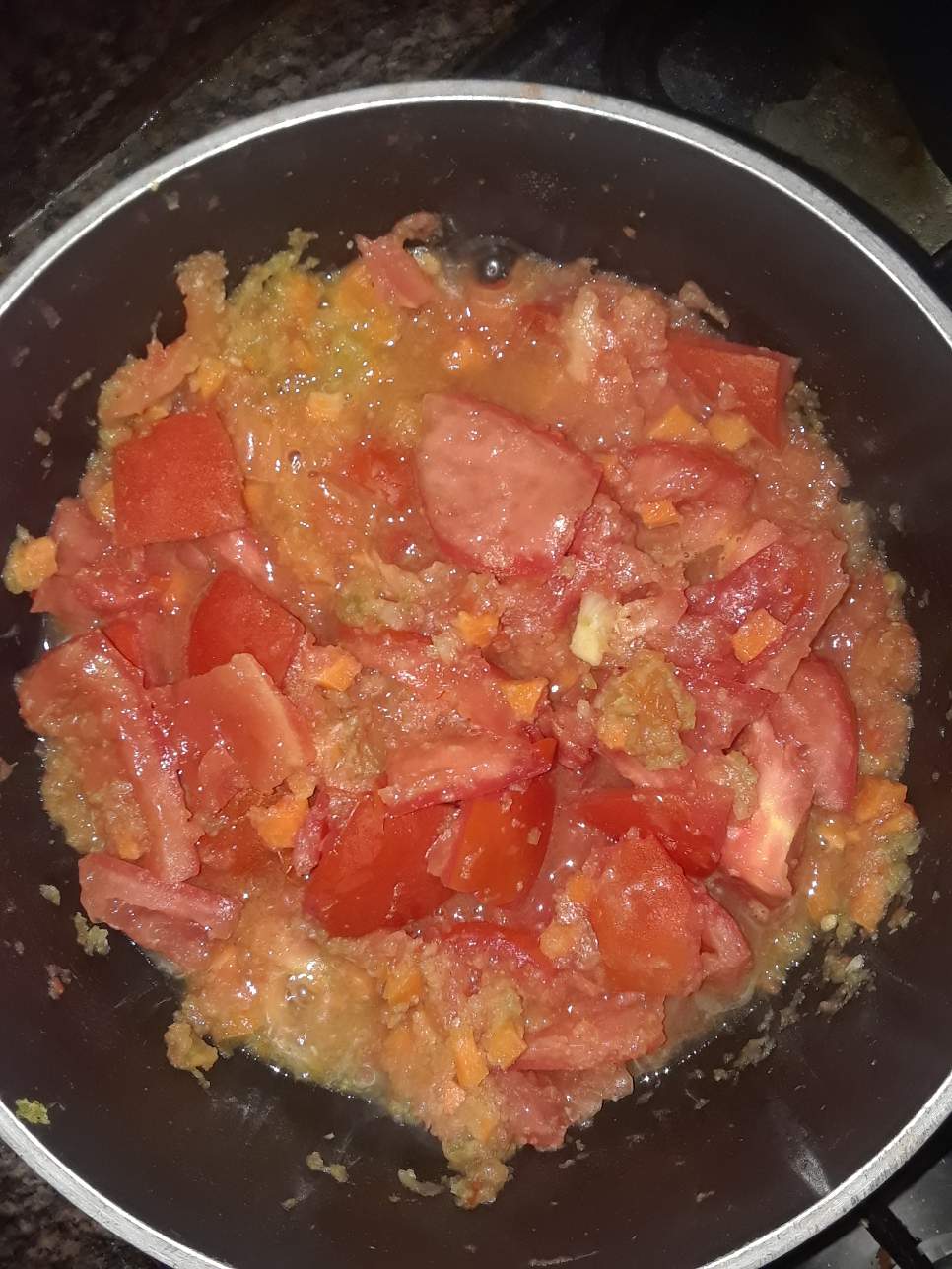 - Dejan cocinar hasta que el tomate esté blando, una vez listo agregan esta preparación a la licuadora o procesador de alimentos y nuevamente la colocan al fuego.