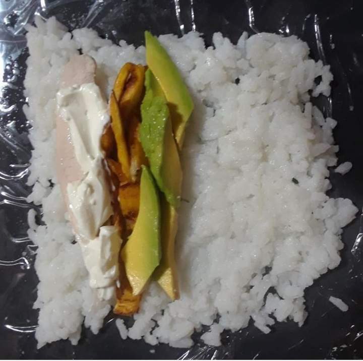 - Lo siguiente es proceder con el armado, colocan una capa no tan delgada de arroz y en uno de los extremos colocan el resto de los ingredientes, luego comienzan a enrollar y a su vez van ajustando.