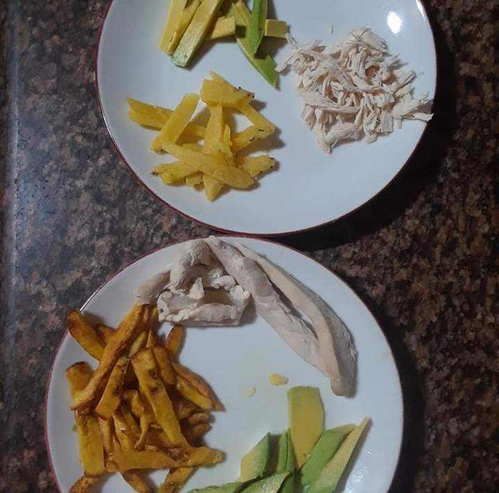 - Para bebes menores de 1 año el plátano pueden sancocharlo y el pollo lo pican más pequeñito.