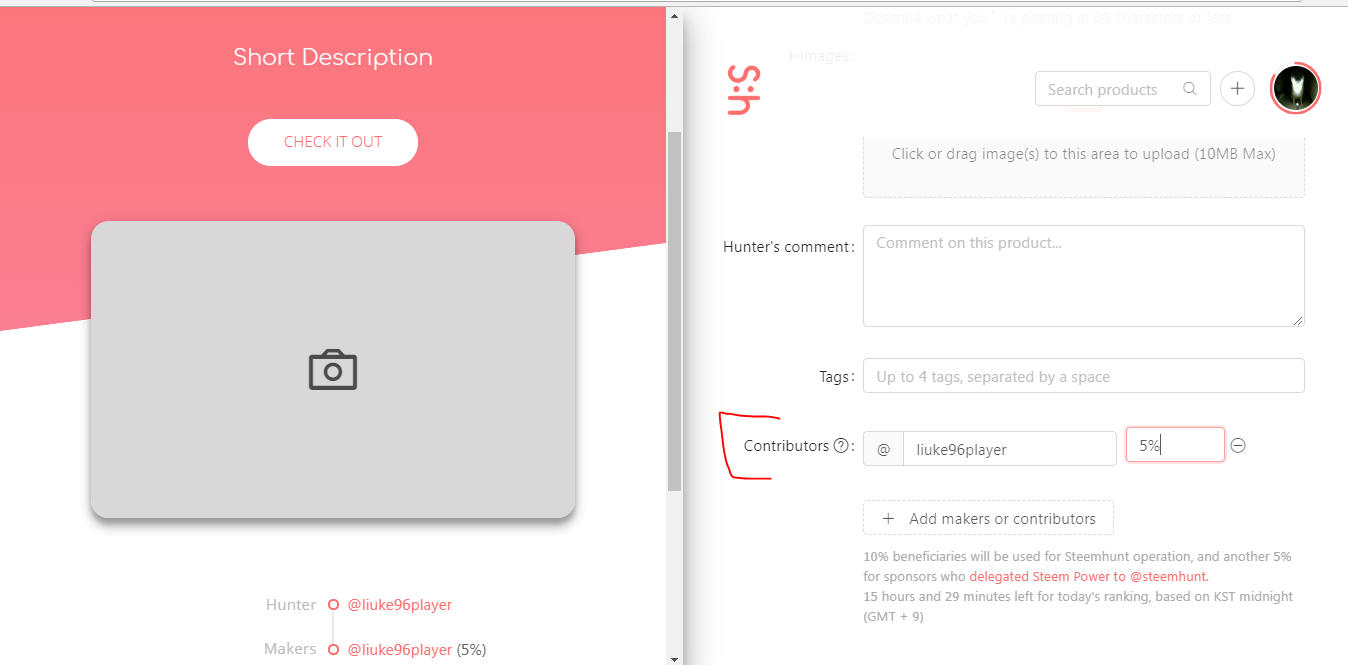 El segundo requisito es, cuando crean una publicación en steemhunt, en la parte de add contributors, pongan el usuario @liuke96player, con un mínimo de 5%, que será considerando una donación para seguir aumentando el steem