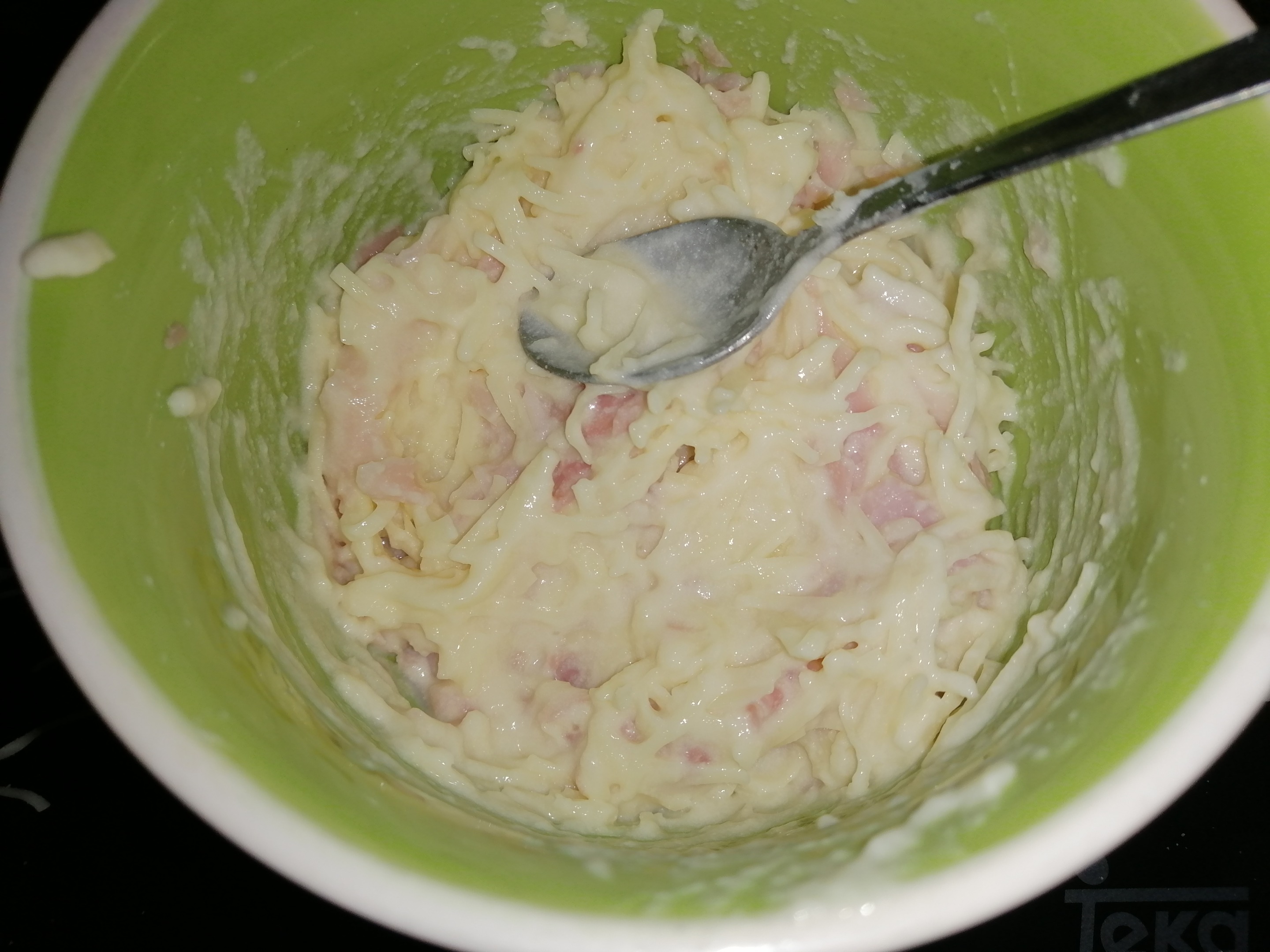 2- En un bol añadimos los ingredientes del relleno (en este caso jamón, queso rallado y bechamel)