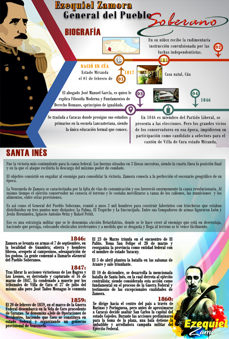 Hoy quiero presentarles una pequeña infografía sobre los hechos más importantes de la vida del General del Pueblo Soberano «Ezequiel Zamora» quien fue una persona humilde y un subestimado pero indiscutido líder de la guerra federal venezolana.