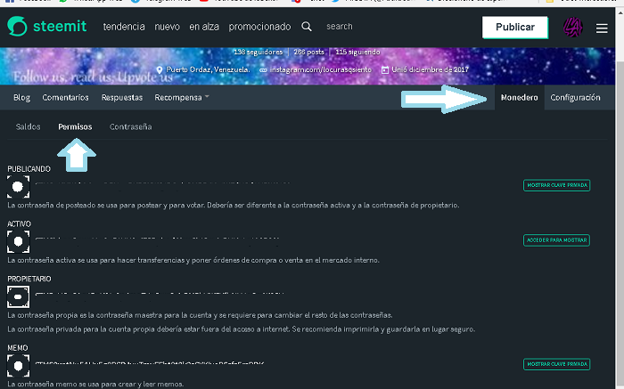 Para usar estas alternativas necesitas tu clave de publicación que la puedes conseguir en tu blog. Clickea en la pestaña “monedero” y luego en la pestaña “permisos”, allí puedes encontrar las distintas contraseñas que necesitas, estas contraseñas son privadas y no debes compartirlas con nadie.