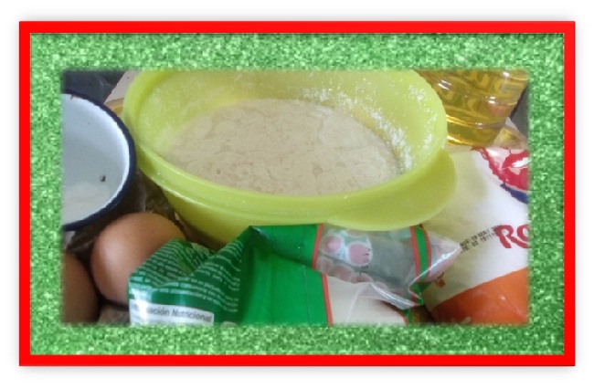 3.- Vertemos a la mezcla de la torta seguidamente la harina de trigo y el polvo de hornear, bicarbonato y añadimos por cada taza de harina una taza leche de coco natural previamente elaborado y añadimos residuos de coco también y mezclamos todos los ingredientes muy bien hasta conseguir una mezcla homogénea.