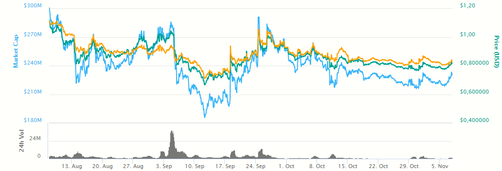 En el último mes el Token STEEM se mueve en un acotado rango entre US$ 0,78 a US$ 0,88. Al momento de la redacción cotiza cerca de la banda inferior.