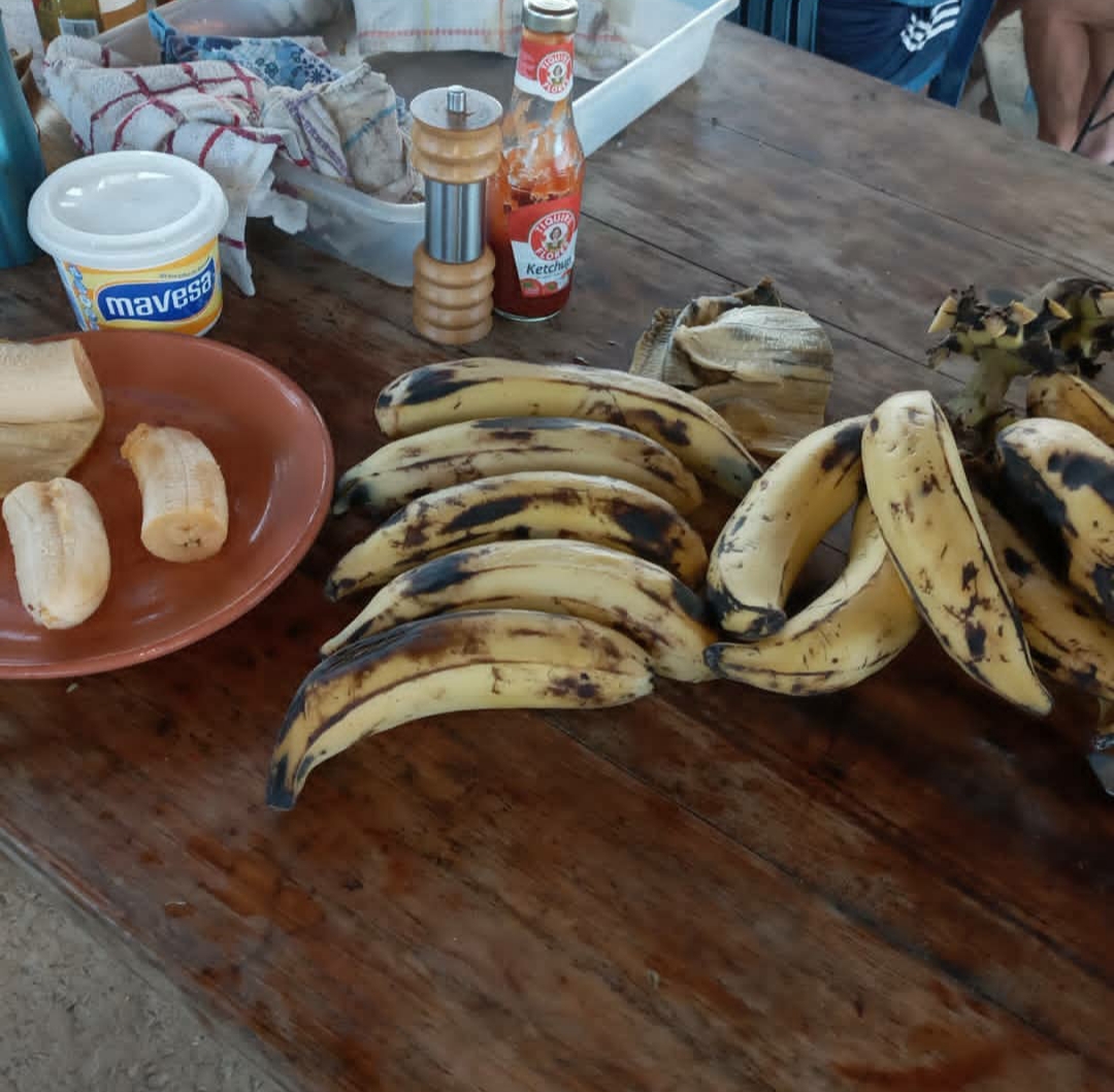Posteriormente pelamos los plátanos, rebamos en tajadas y las freímos, luego las colocamos en papel absorbente para tratar de eliminar el exceso de grasa.