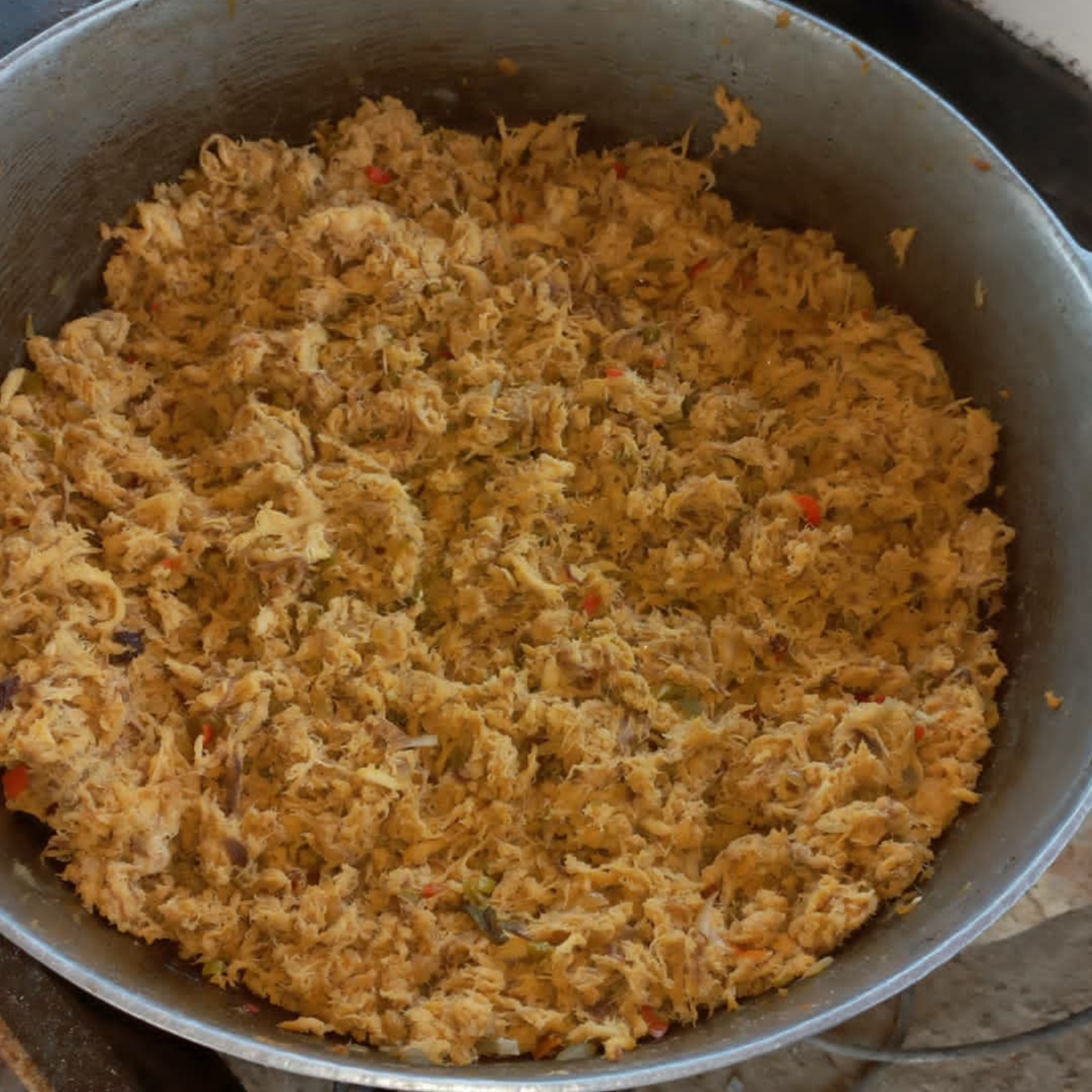 En un caldero calentamos el aceite y agregamos uno a uno los ingredientes del sofrito, salteandolo por cinco minutos. Luego poco a poco incorporamos el pescado previamente desmenuzado, añadimos sal y pimienta y cocinamos a fuego bajo entre diez y quince minutos hasta obtener un guiso. Luego apartamos.